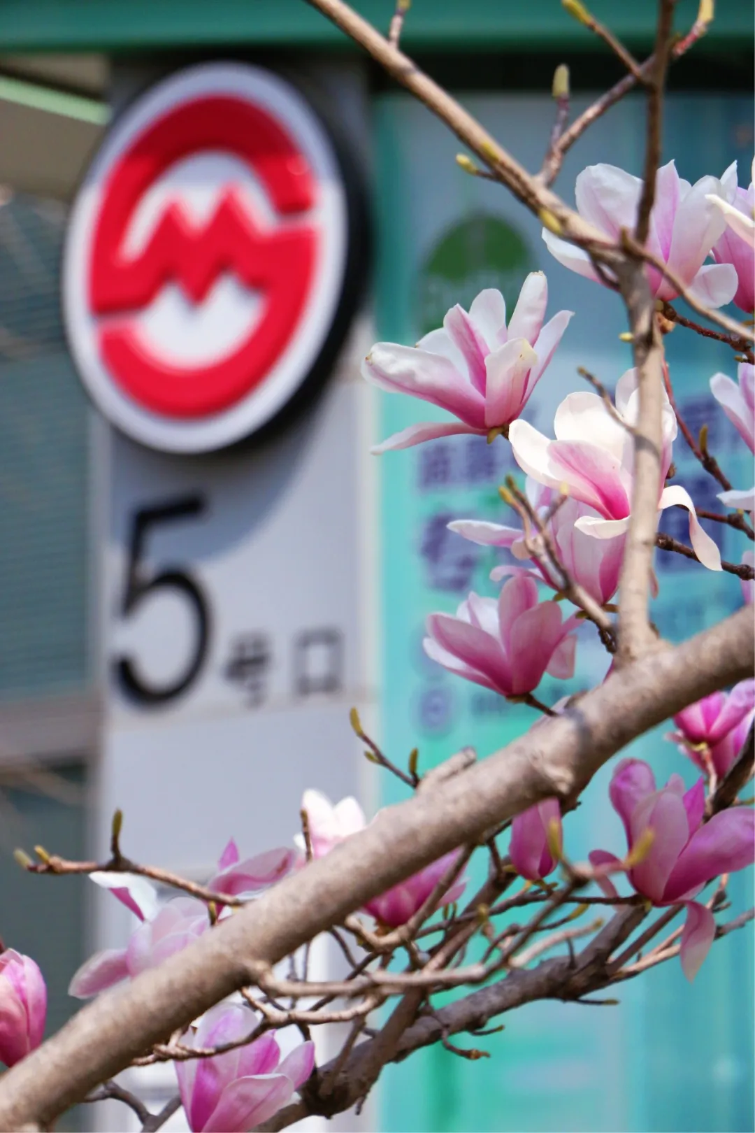 在4号线、18号线大连路站5号口,一朵朵如粉色水晶灯一样的玉兰迎风绽放,与地铁口的图案形成鲜明对比,氛围感直接拉满。