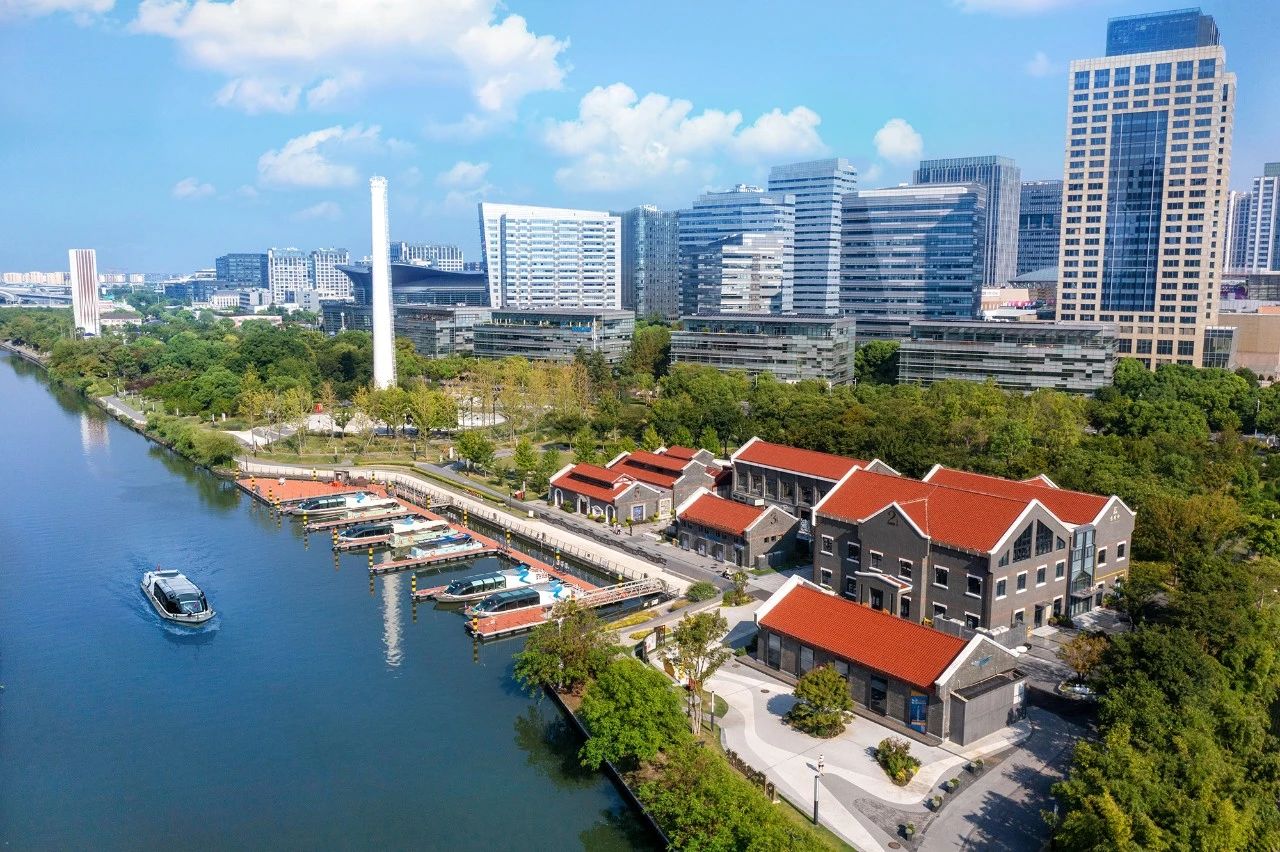 赛道起点位于天安千树毗邻的莫干山路。跑者启程之际,目光所及皆是这座由工业遗存涅槃重生的滨河商业体——巨型山形建筑融合黄山的山脉意向和古巴比伦空中花园的联想,千株绿植破壁而出,与四百余个柱状露台构筑成远近闻名的“悬浮森林”。艺术与自然在此交融,为奔跑注入第一缕诗意的晨曦。