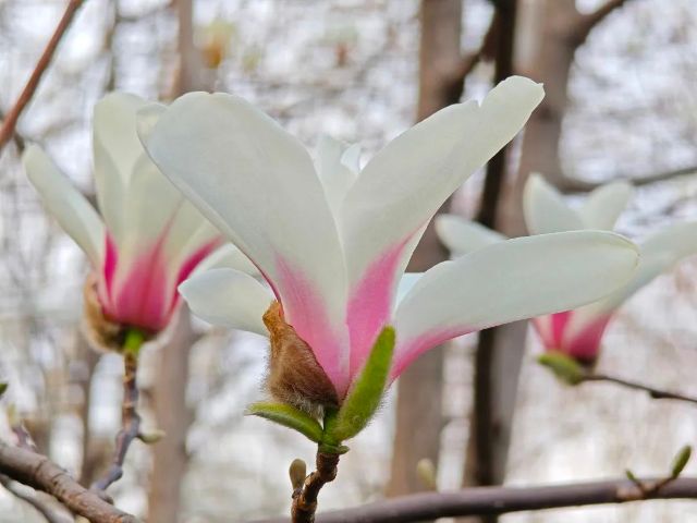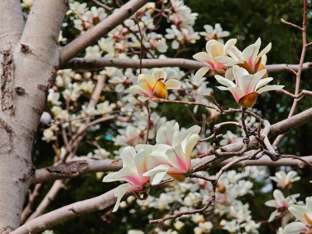 城市的春日惊喜更绽放在匆匆步履间,沿着田林党群服务中心广场、漕溪路乐汇小游园,白玉兰或含苞待放,小巧玲珑的花苞如同羞涩的少女,蕴含着无限的生机与活力;或尽情绽放,每一片花瓣都舒展得恰到好处,展示着自己的风姿。洁白的花朵与周围的绿树、青草相互映衬,构成了一幅美丽的春日画卷。