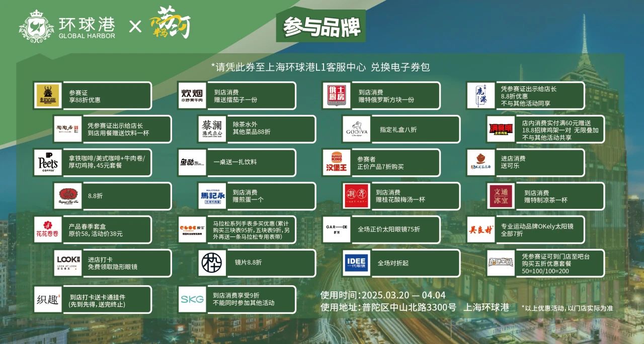 2025中国农业银行上海市分行上海苏州河半程马拉松赛将于3月23日盛大启幕。为让跑者们尽情奔跑,深度体验普陀区现代都市的魅力与精致生活气息,普陀区商务委、区体育局携手区内多地标商圈,特别为苏州河半程马拉松跑者打造了“赛事商圈”专属优惠。