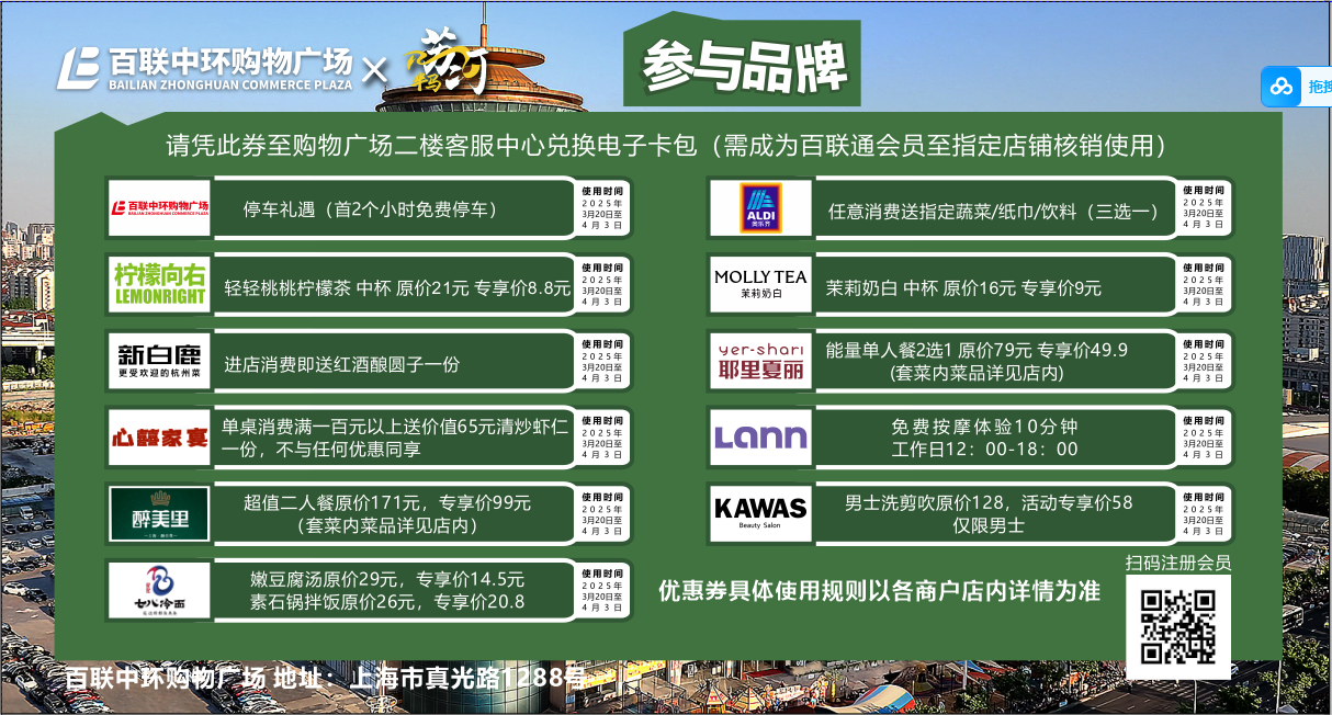2、各家商场推出的优惠券在可用时长及商户上各有不同,请以实际情况为准。