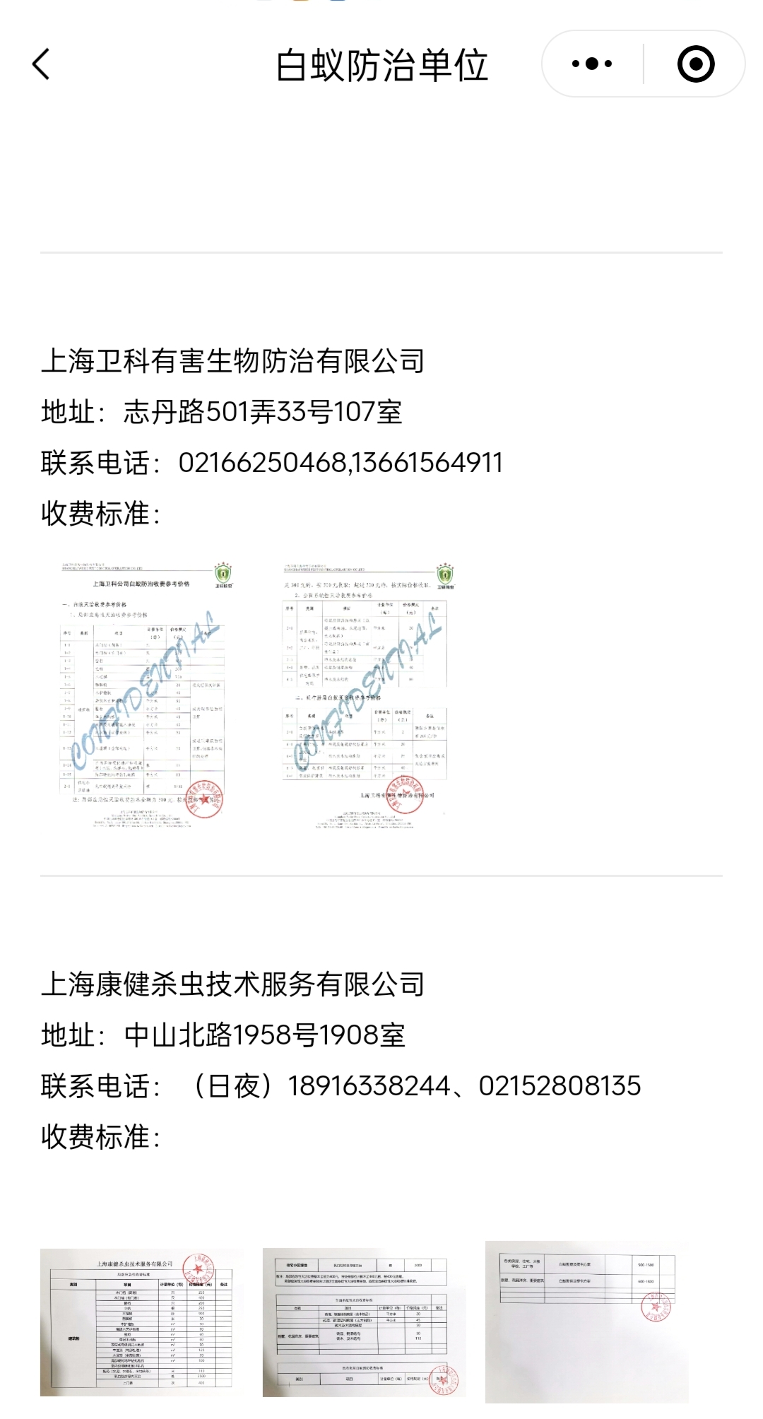 注册“上海物业”小程序,绑定小区后,可在“上海物业”小程序“寻找服务”菜单中的“白蚁防治企业”名录中查询白蚁防治企业的联系电话、收费标准等。