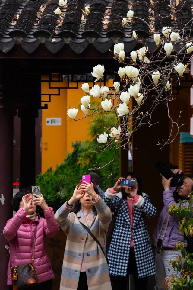 在徐汇的街角,白玉兰的皎洁让整座城浸入清雅的诗意。喜爱摄影的人们,勾勒出建筑曲线舒展与自然浑然一体的构图。而在龙华寺,白玉兰以孤傲之姿立于黛瓦白墙前,阳光为花瓣镀上金边,暗香浮动间,恍若《离骚》中“朝饮木兰之坠露”的意境穿越千年。