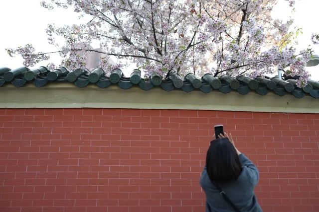 在上海交通大学华山路校门口,人们会驻足校门前留影,恰逢几株樱花从校内透出,引得路人纷纷拿出手机拍照留念。