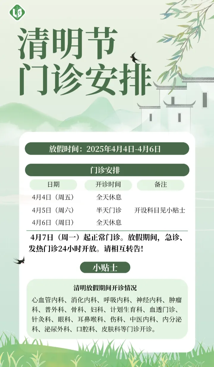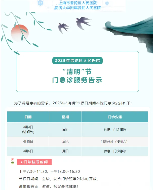 2025年清明假期普陀区中心医院、普陀区人民医院、普陀区利群医院门诊工作安排如下:
