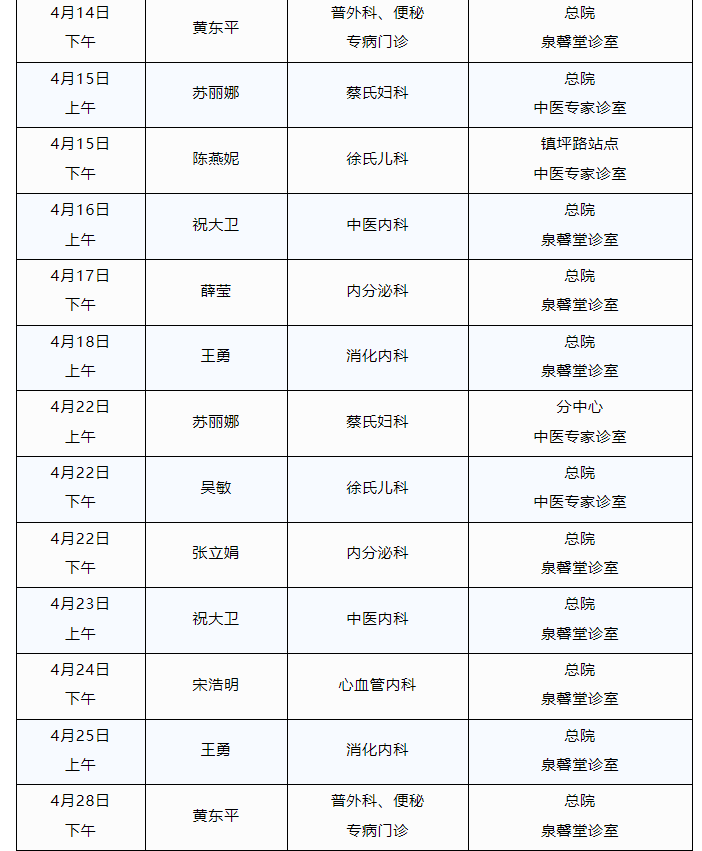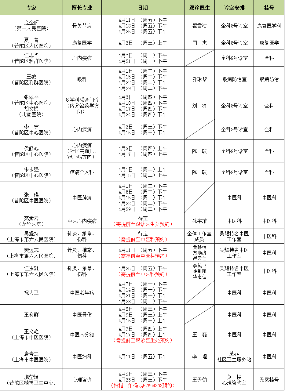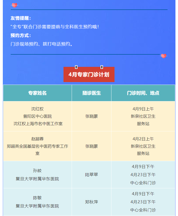 另:陈敬贤副主任每周二上午东新站点吴政医生处预约;失眠门诊每周二下午东新站点1楼名中医工作室预约,避免跑空!