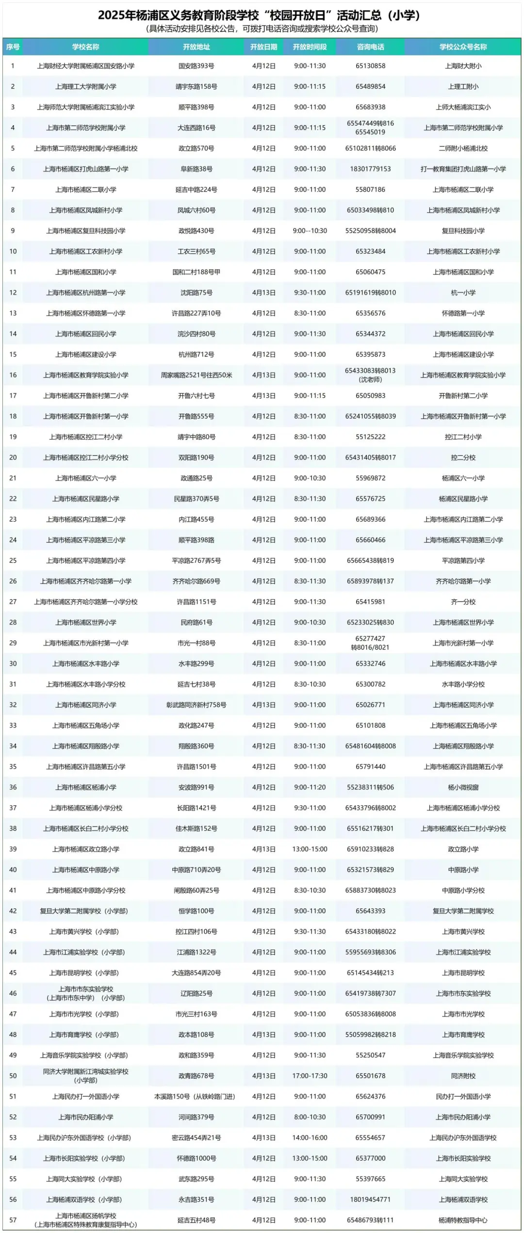2025年杨浦区义务教育阶段学校“校园开放日”活动汇总(小学)