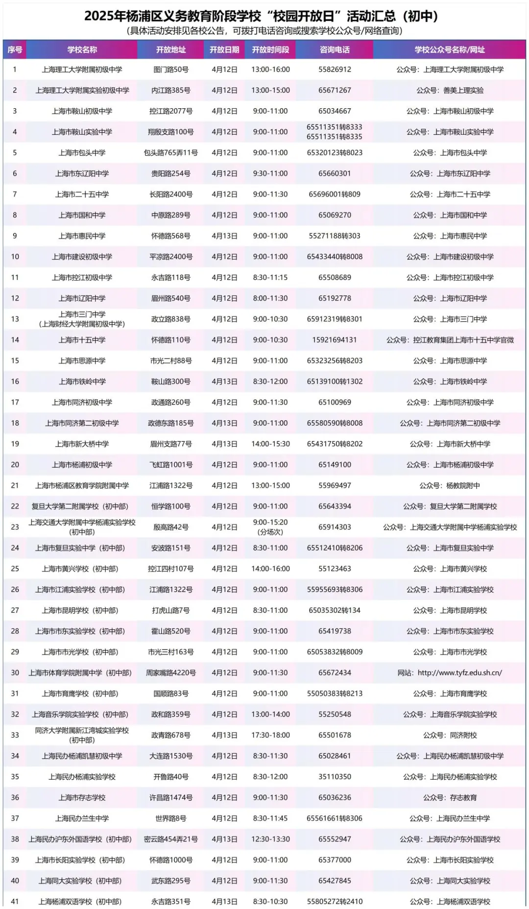 2025年杨浦区义务教育阶段学校“校园开放日”活动汇总(初中)