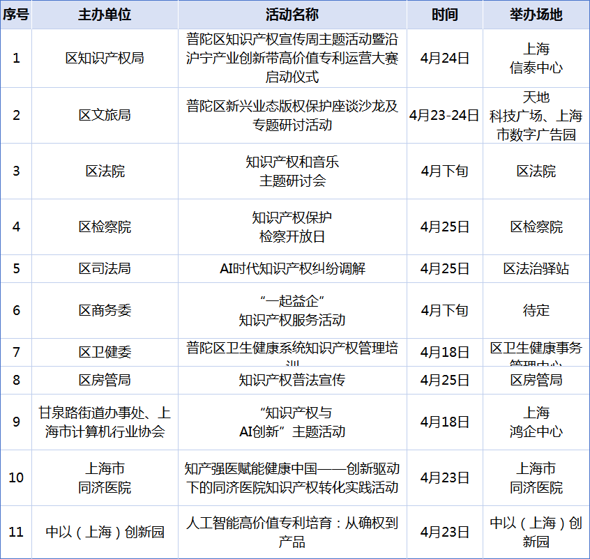 为积极响应上海知识产权宣传周工作部署,全面提升社会公众尊重和保护知识产权的意识,在第25个世界知识产权日来临之际,普陀区将围绕“知识产权与人工智能”主题,推出一系列形式多样、内容丰富的主题活动。