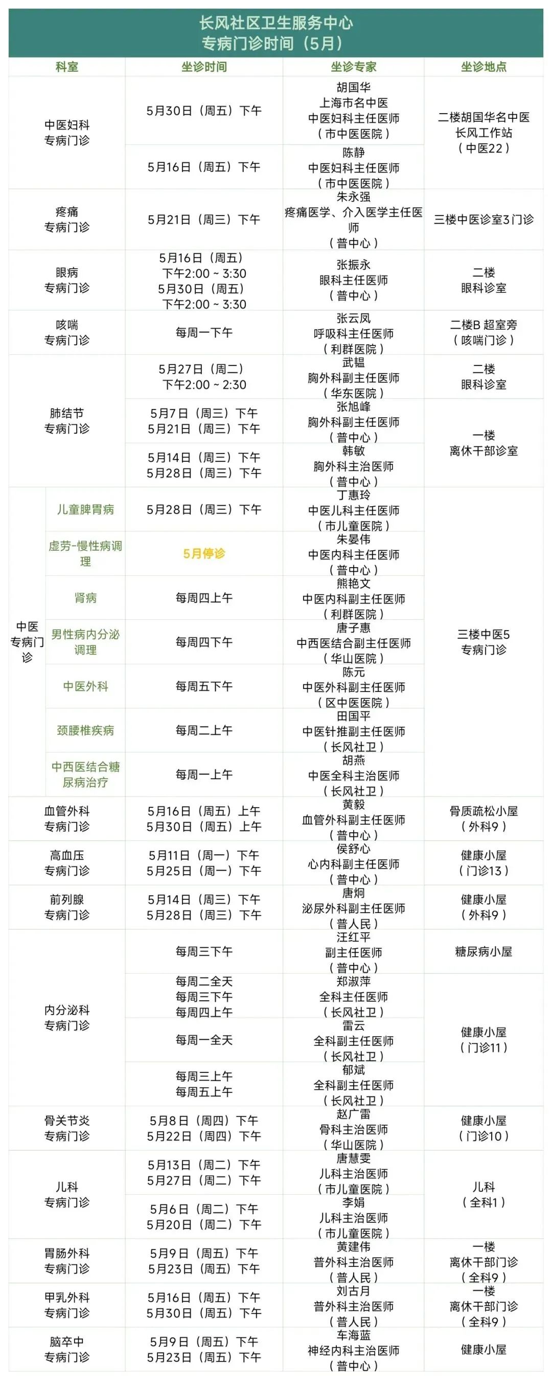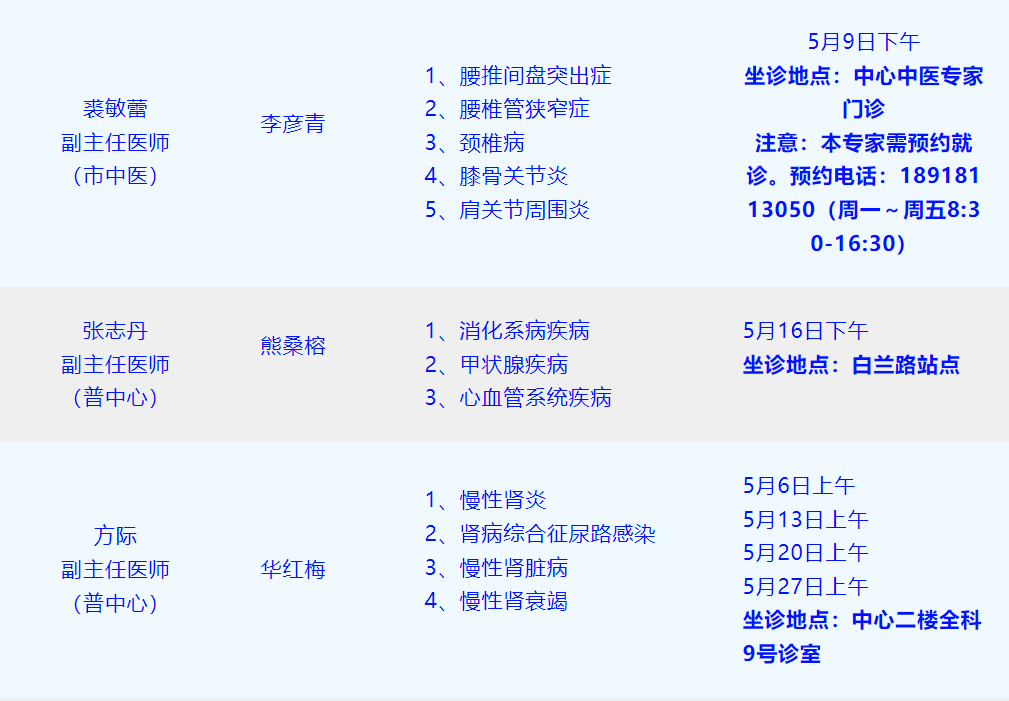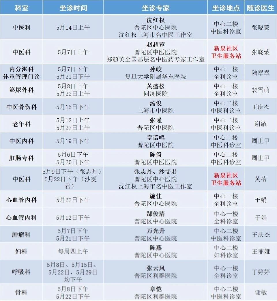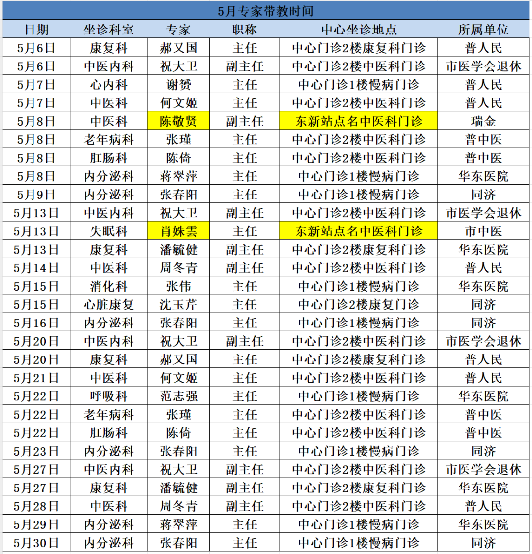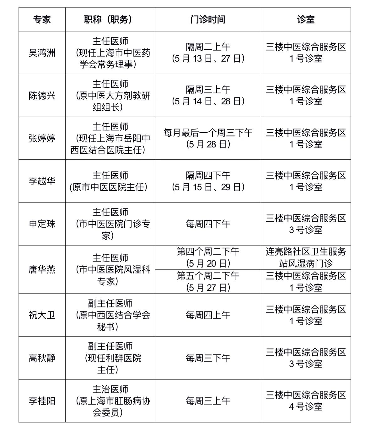 为了让桃浦镇东部地区居民享受优质的中医医疗服务,中心特别邀请了上级医院的知名中医专家前来坐诊。现将5月的中医专家门诊安排公示如下: