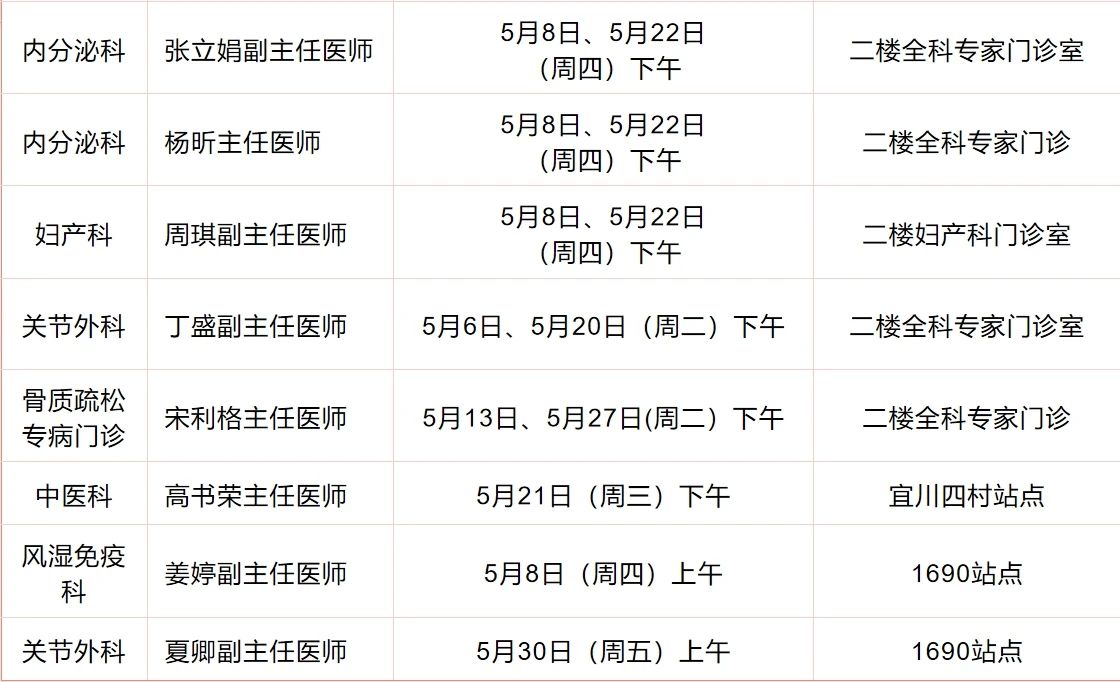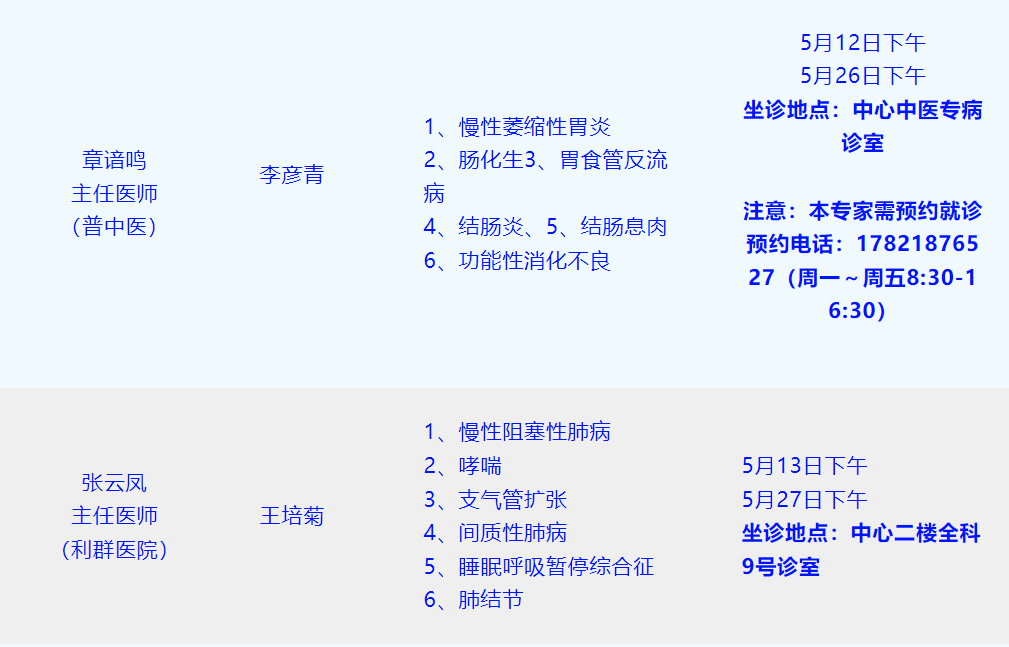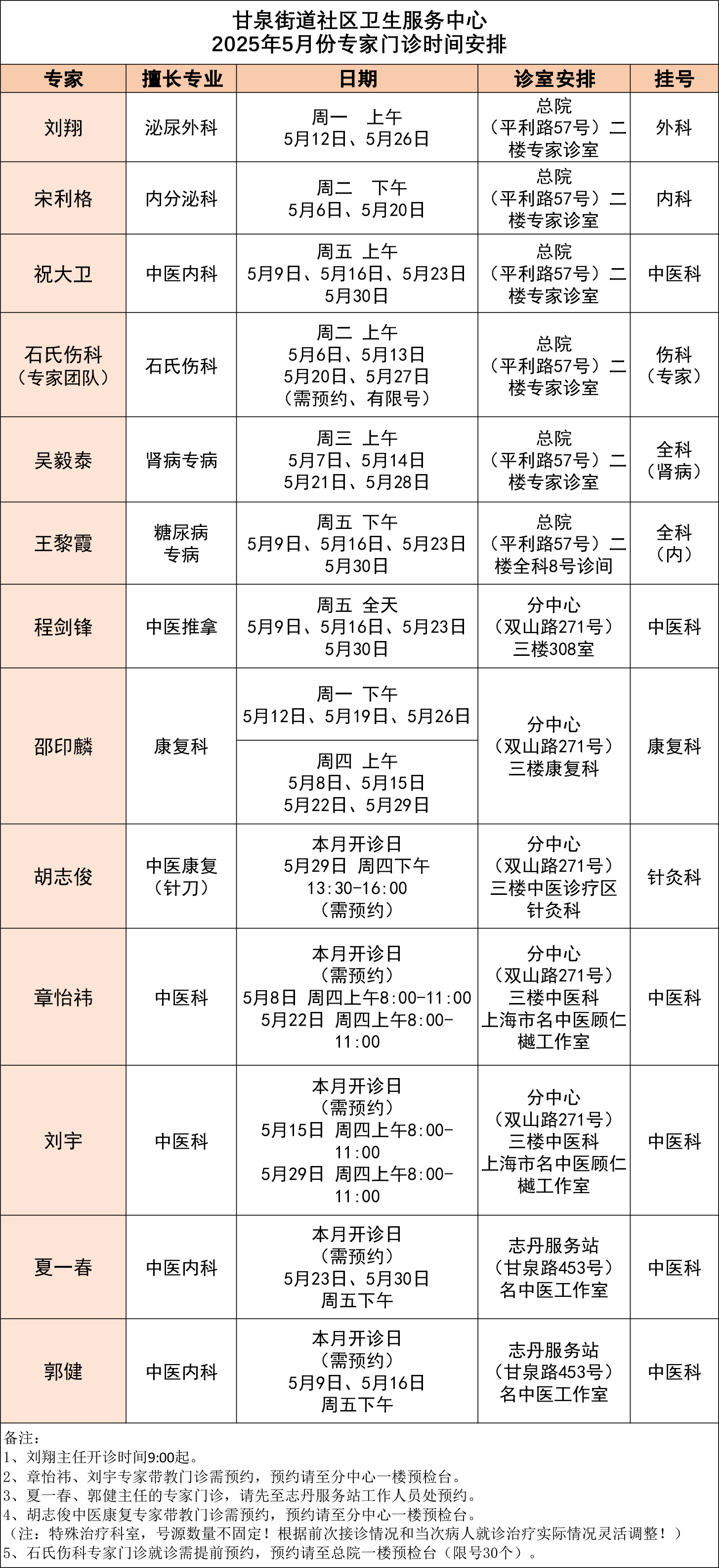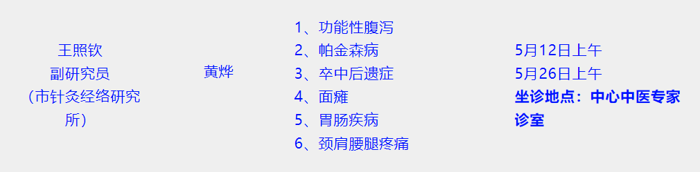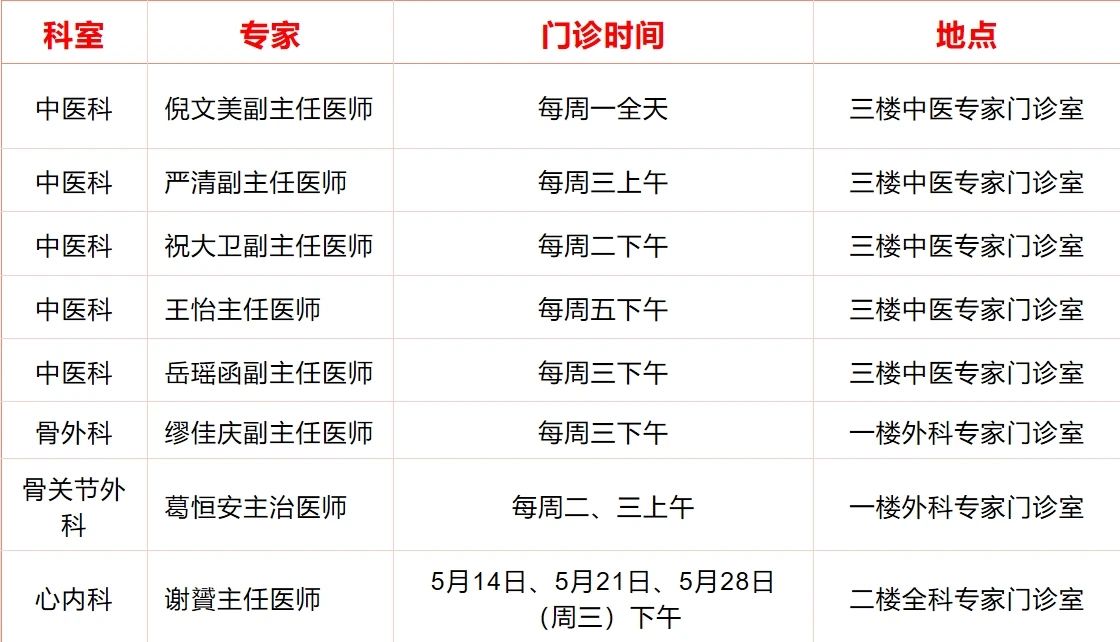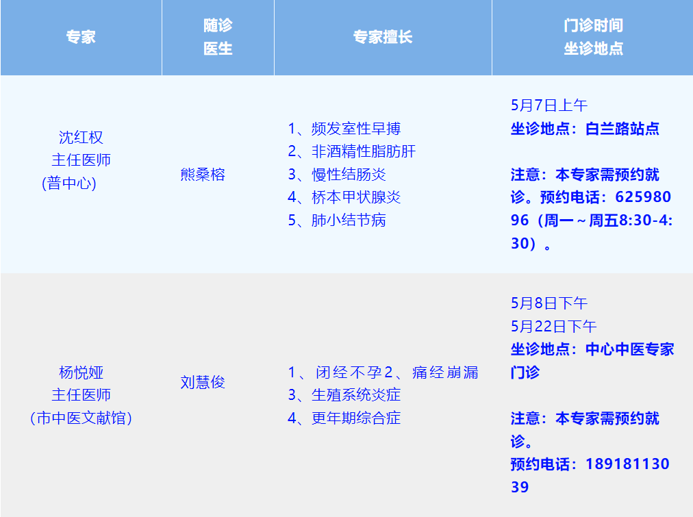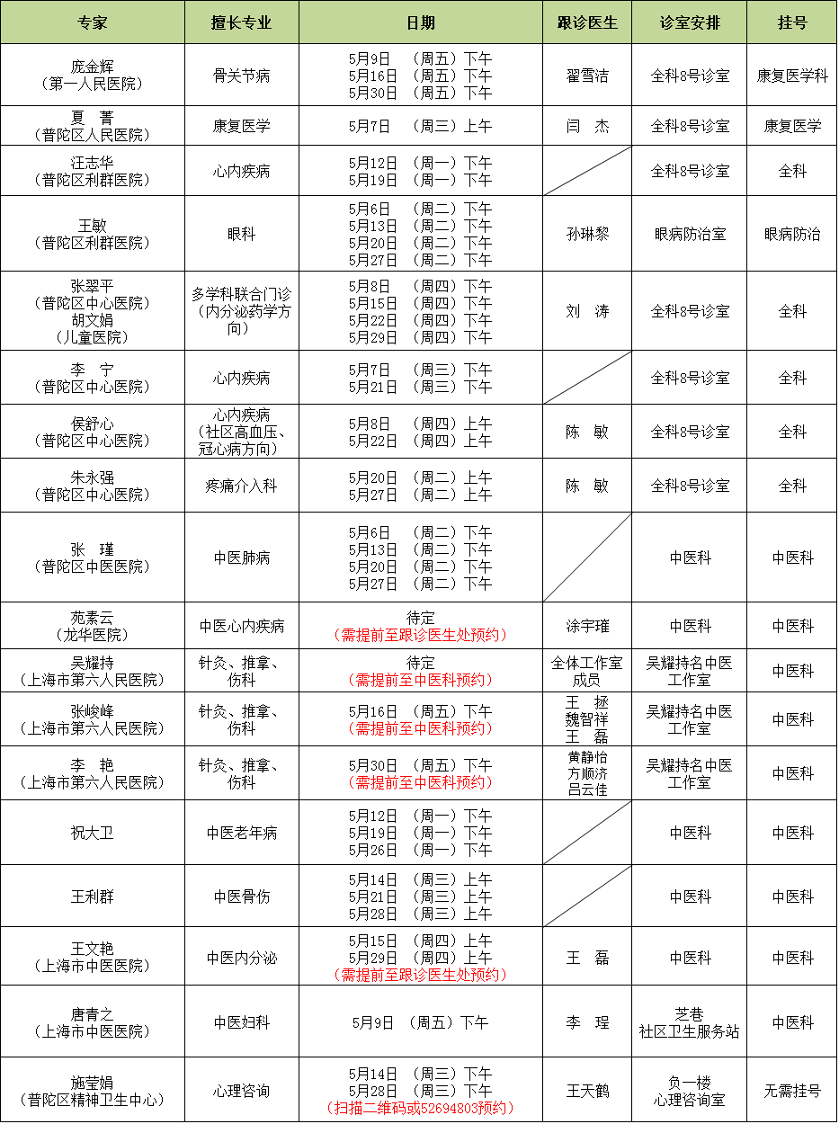 为了让桃浦镇东部地区居民享受优质的中医医疗服务,中心特别邀请了上级医院的知名中医专家前来坐诊。现将5月的中医专家门诊安排公示如下: