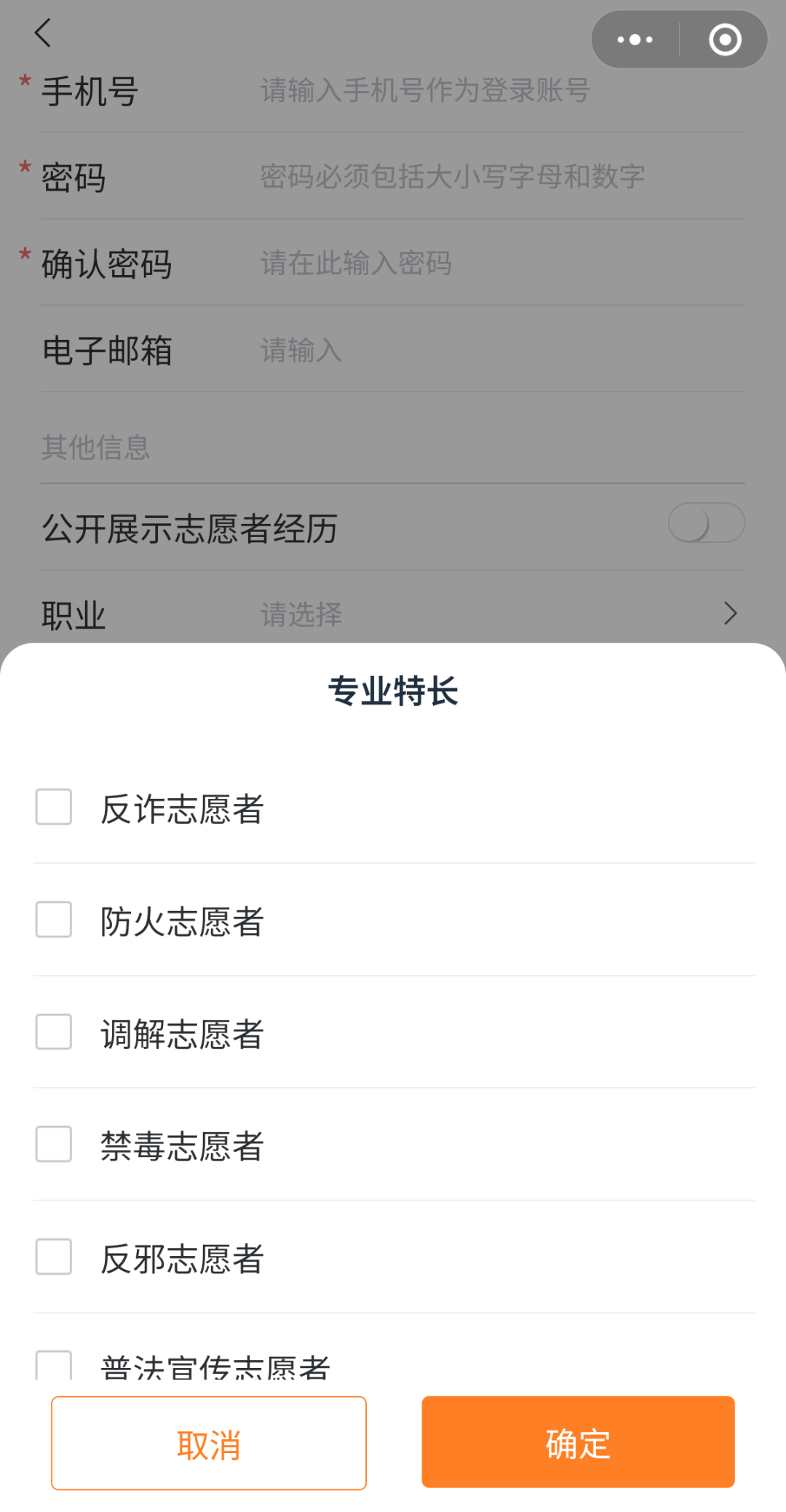 平安志愿者不同于一般的社会志愿者,参与志愿服务往往需要更强的专业技能和应急处置能力。依托小程序建立的平安志愿者数据库,实现了对志愿者信息的数字化、标签化管理。在志愿者注册时,便可根据自身特长选择反诈、消防宣传、解纷、禁毒、反邪、普法、心理辅导、平安护校等专业标签,并明确服务区域。