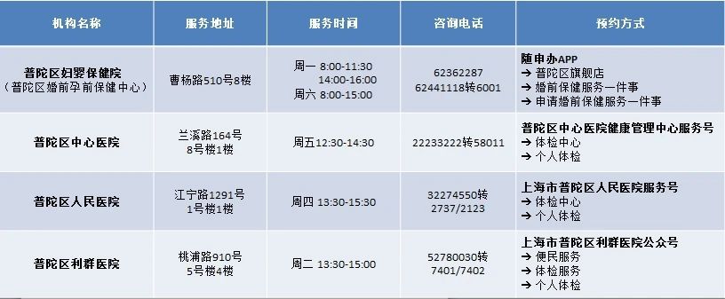 为更好地服务广大新人,普陀区在原有婚前孕前保健中心基础上,增设了3家婚前医学检查服务机构,2025年5月20日起开放服务。