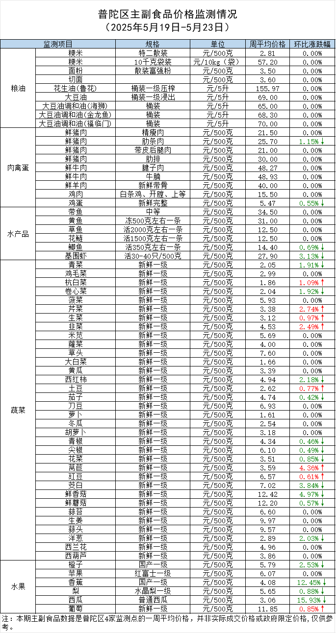 普陀区主副食品价格监测情况(2025年5月23日)