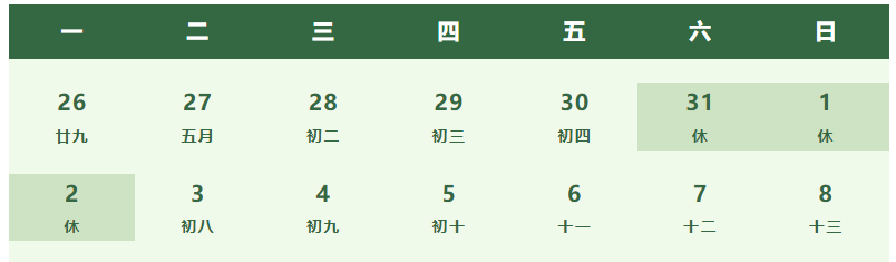 一、5月31日(星期六)至6月2日(星期一)放假休息。
