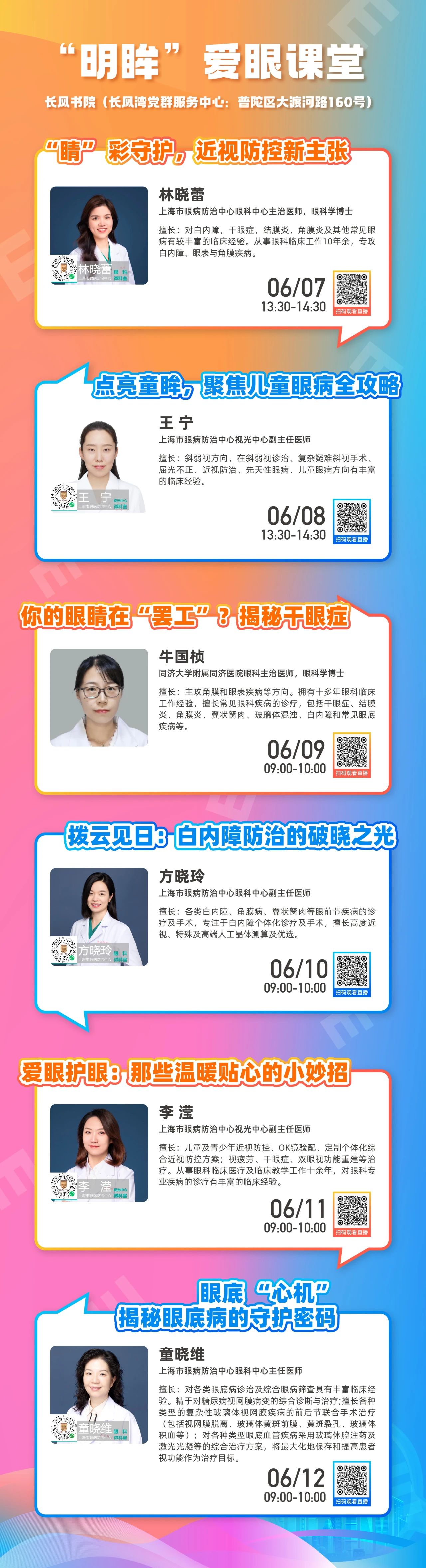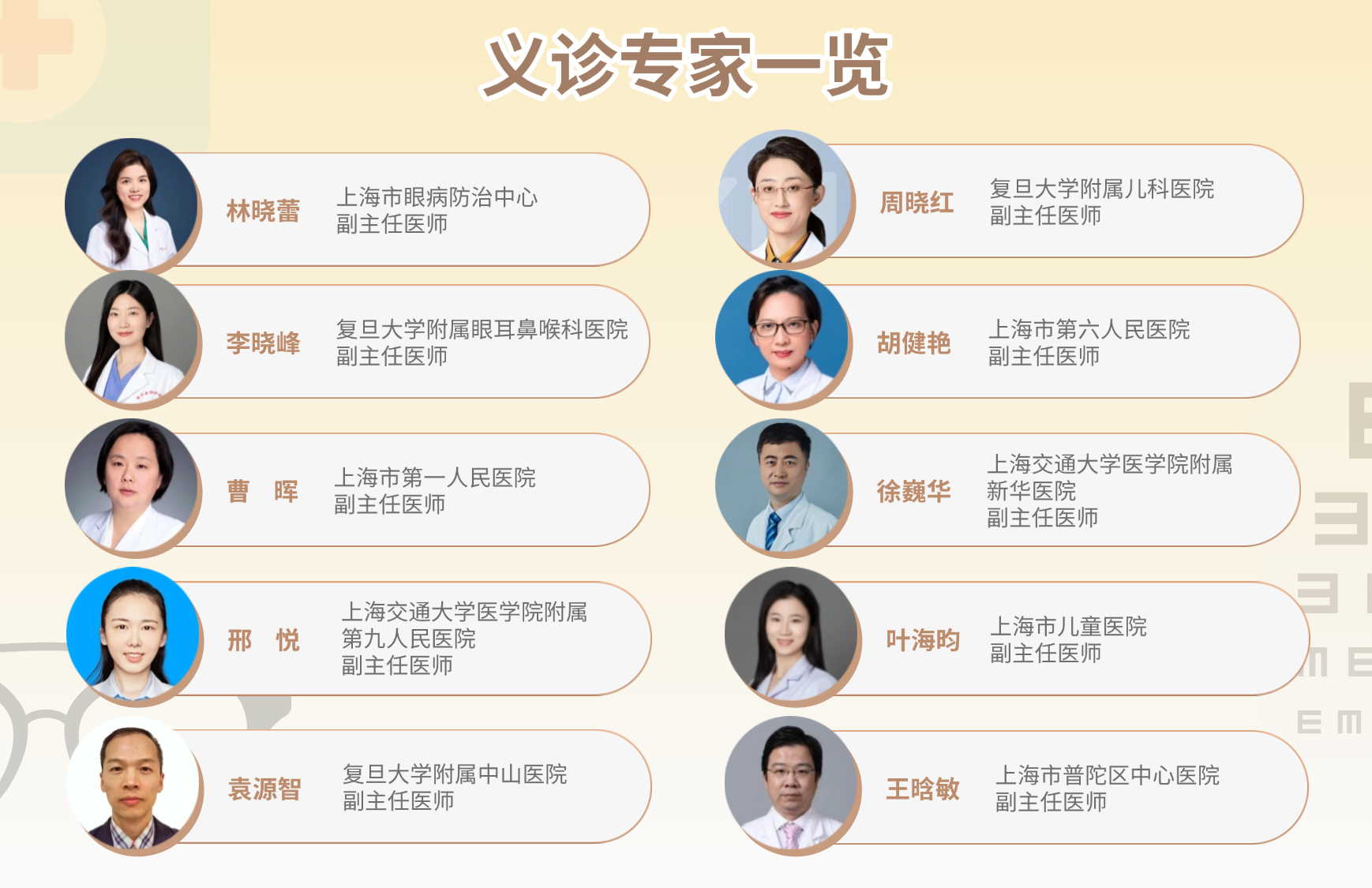 每天一位眼科知名专家面对面科普+互动问答,干货满满,不容错过!将在健康云、上海市眼病防治中心微信视频号/微博同步线上直播。