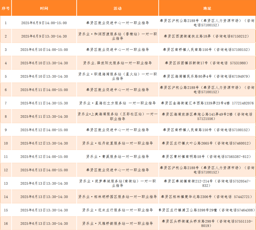 奉贤区“15分钟就业服务圈”6月9日-6月13日站点活动安排