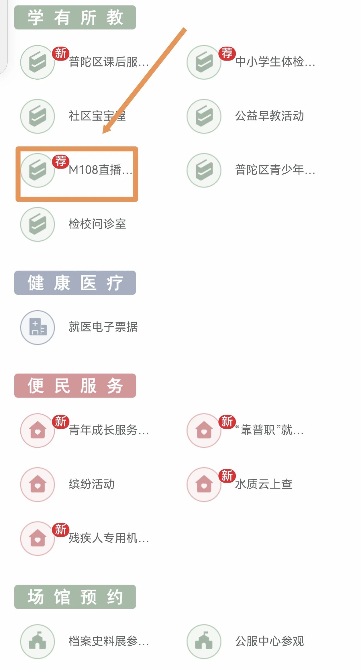 第二步:点击普陀旗舰店首页的“热门应用-更多”,找到“学有所教-M108直播”图标,点击进入;