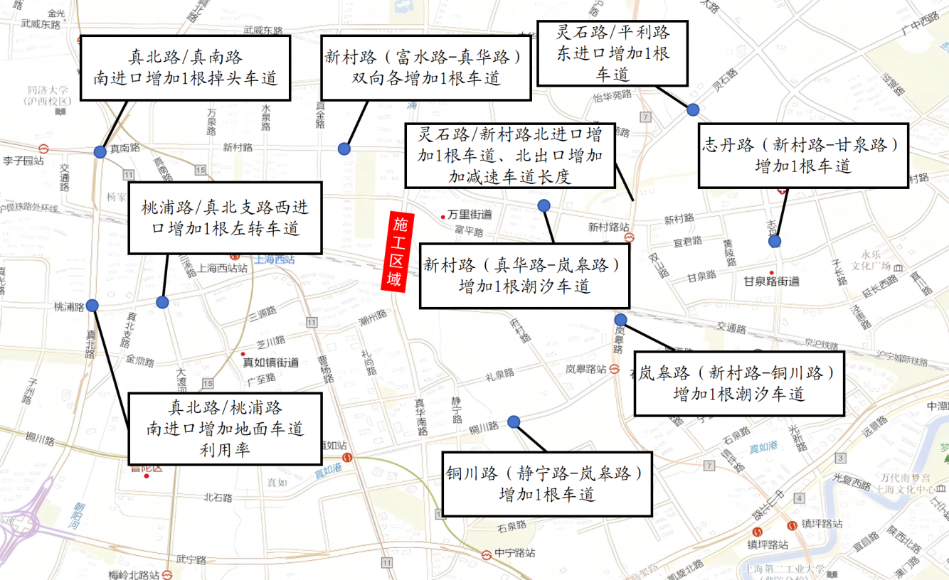 为降低施工对区域交通产生的影响,市公安局交管总队会同普陀支队对新村路、岚皋路、铜川路等主要绕行道路和周边路网进行了工程性改造,充分挖掘道路潜力,提高道路通行能力。