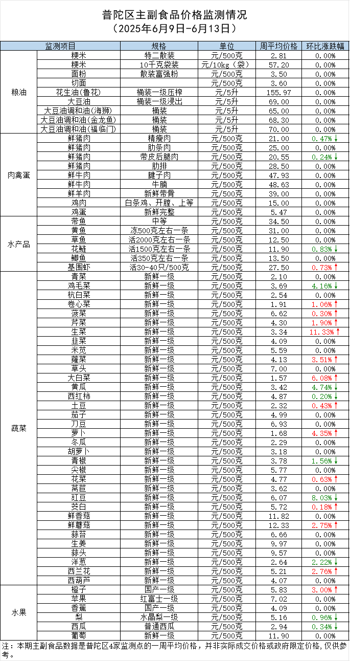 普陀区主副食品价格监测情况 (2025年6月13日)