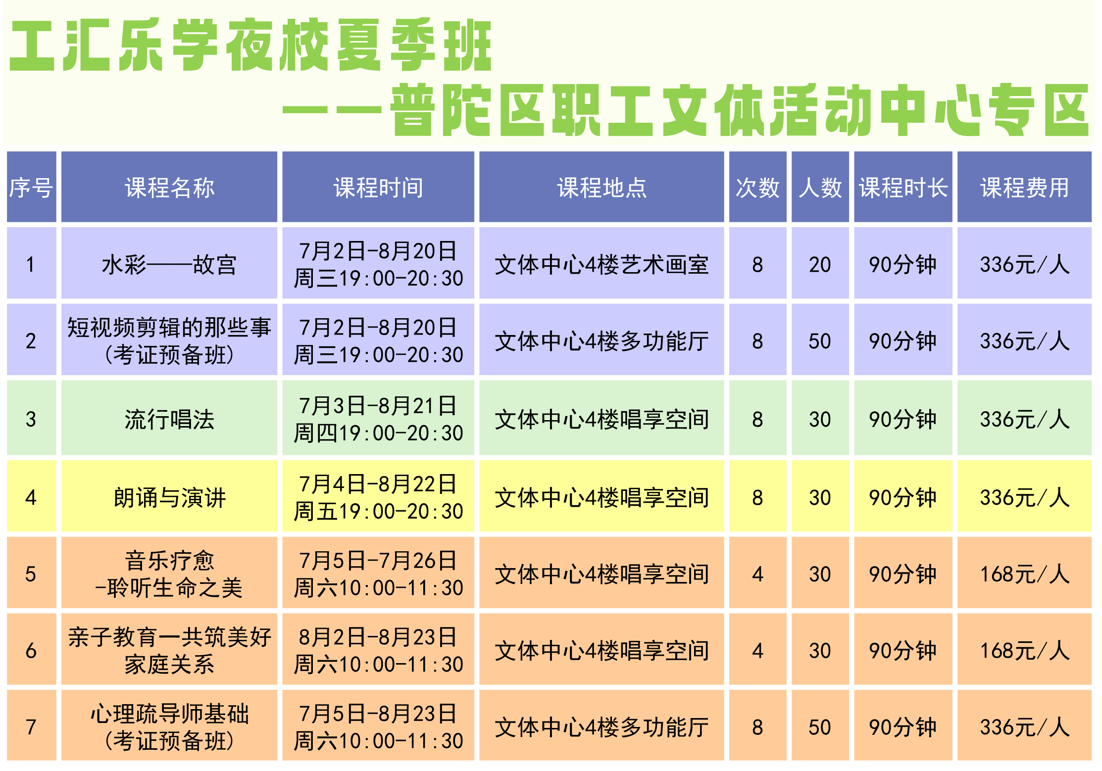 @职场人,属于你的夜校来了!工汇乐学夜校夏季班已开启报名,207门课程,35个教学点遍布全市。其中,普陀区职工文体活动中心共有7门课程,涵盖声乐、朗诵、绘画、心理、亲子、剪辑等教学内容。