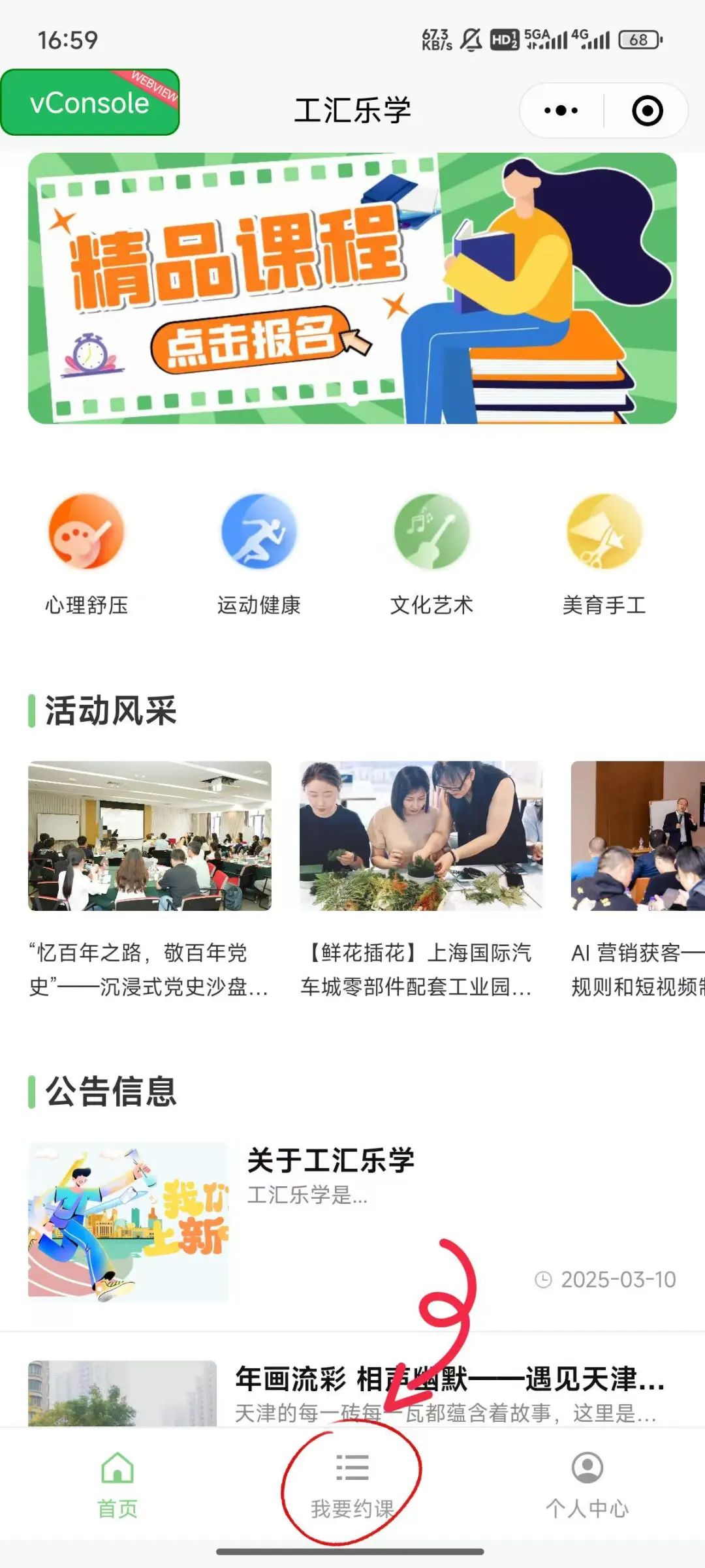 1.长按二维码进入【工汇乐学】小程序,点击【我要约课】版块;