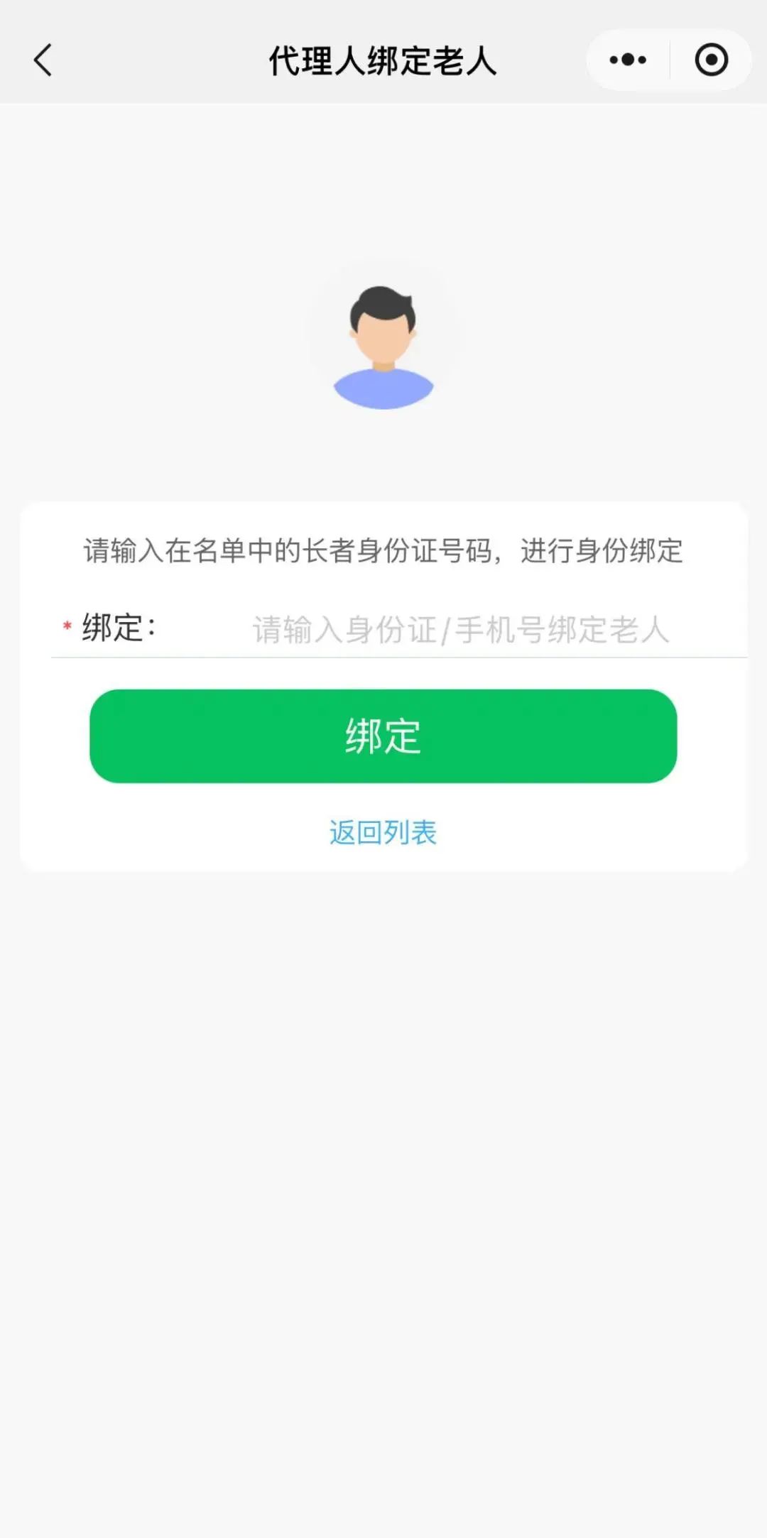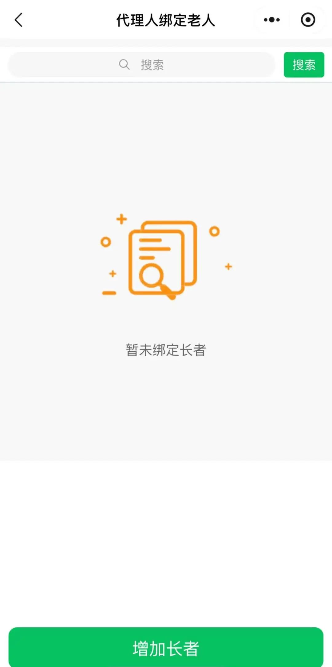 微信授权登录小程序,点击右下角“我的”,选择“增加长者”,输入身份证、手机号,绑定个人信息