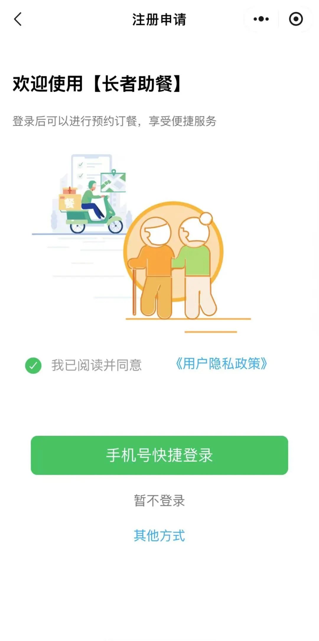 微信搜索“长者助餐”,进入小程序,选择左侧“长者食堂”(提前一天预定)