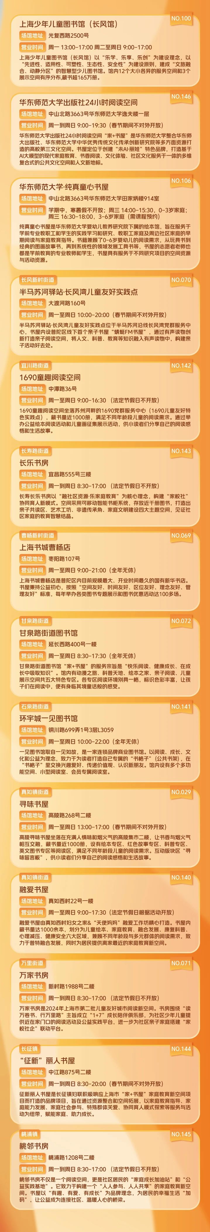 手册内附有普陀区14家“家+书屋”的地址、开放时间及特色活动介绍,家长可根据孩子的兴趣和时间,自由组合路线。