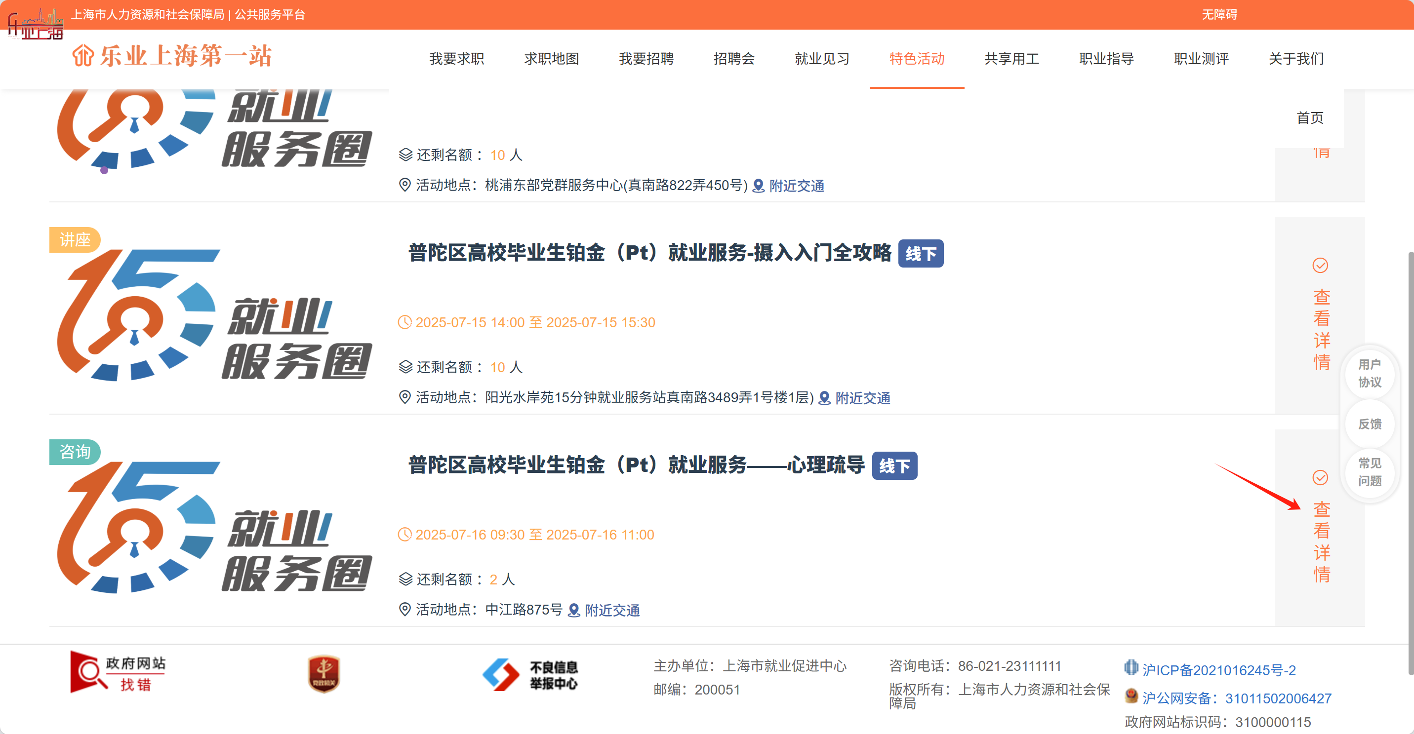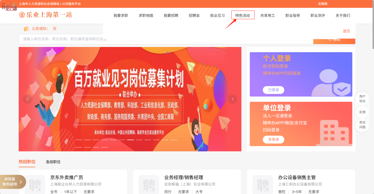 1.打开网页“乐业上海第一站”并完成登录,点击“特色活动”进入界面。