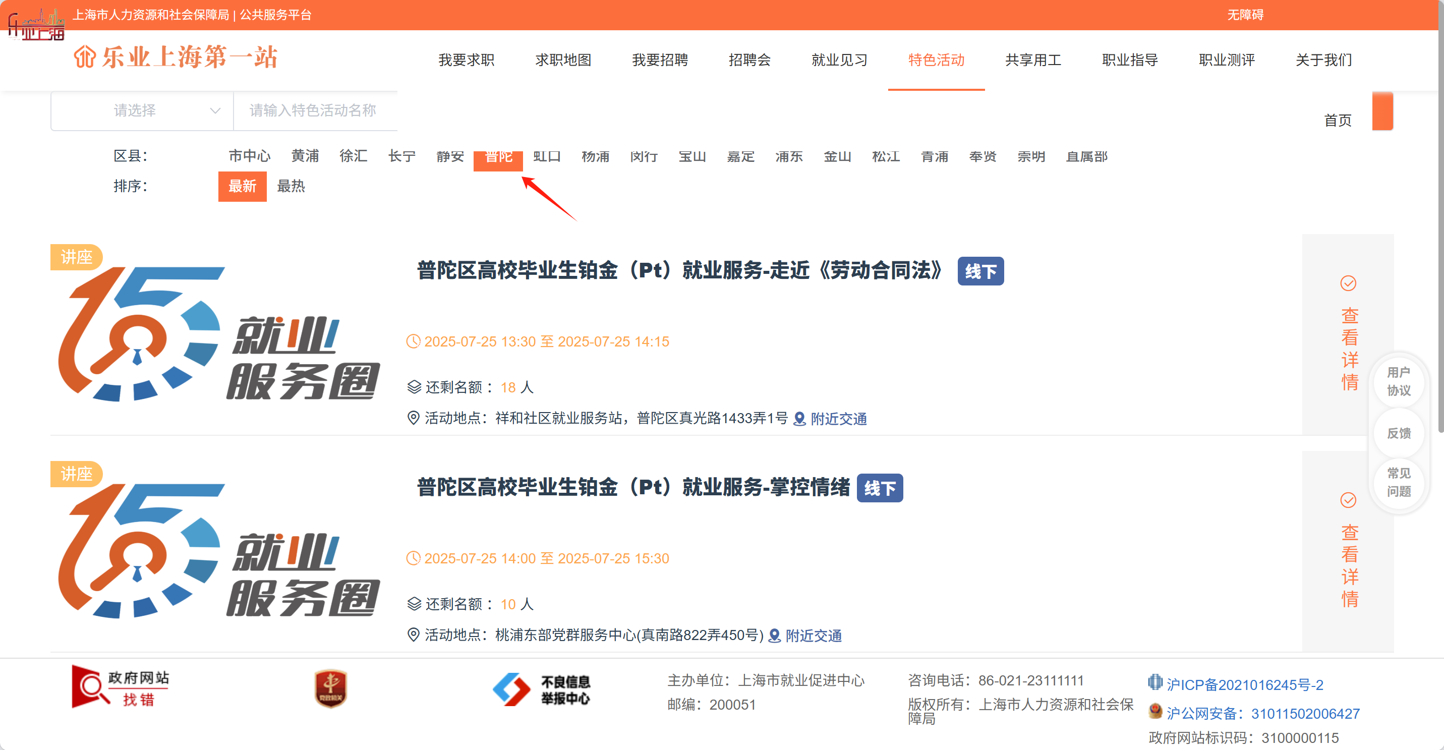2.在“区县”一栏中勾选普陀区,下滑翻找到到对应活动,点击“查看详情”进入详情页。