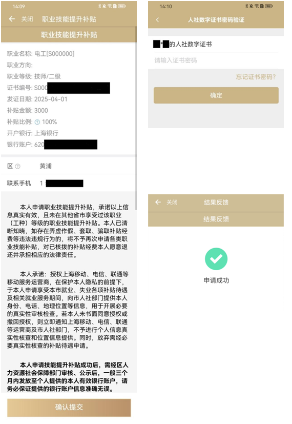 阅读个人承诺及告知事项,确认信息无误后,点击【确认提交】。输入人社数字证书密码,点击【确定】,系统提示“申请成功”即完成申请。