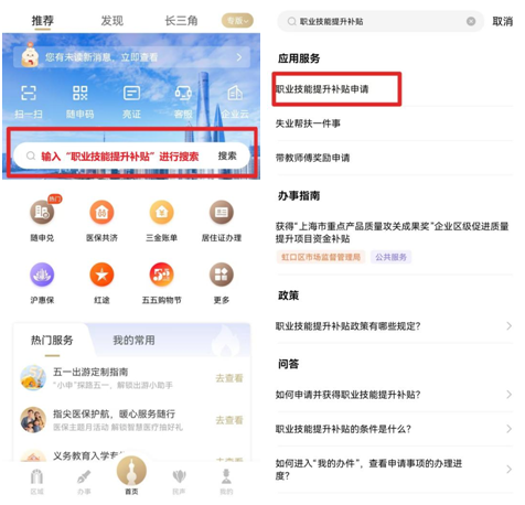 也可在“随申办市民云”APP首页搜索栏中输入“职业技能提升补贴”,在搜索结果中点击“应用服务”中的【职业技能提升补贴申请】事项进入申请界面。