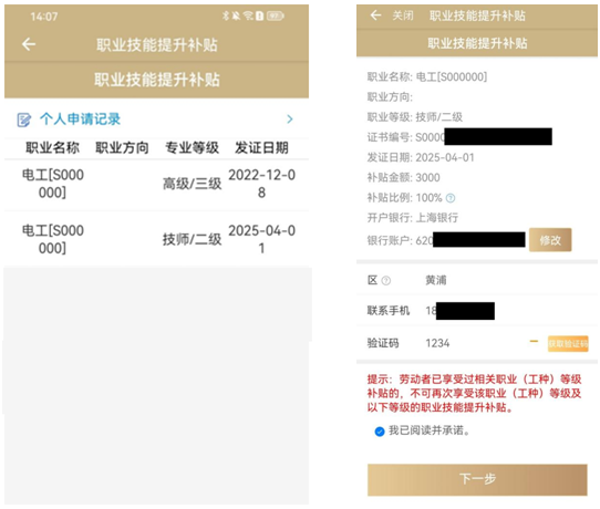 点击需要申请的证书信息,确认补贴金额、补贴比例及个人银行账户信息,如需修改银行账户信息,可点击【修改】按钮维护银行账户信息。