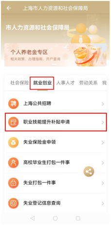 登录“随申办市民云”APP,点击底部【办事】栏目,在服务大厅中点击【按部门】,划动选择【市人力资源社会保障局】,点击【就业创业】,下划找到【职业技能提升补贴申请】事项,点击进入申请界面。
