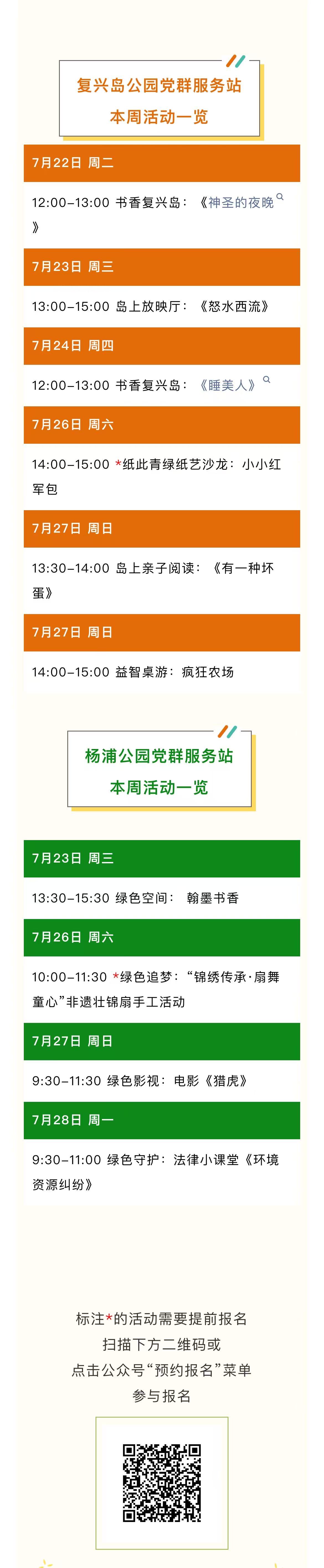 杨浦复兴岛公园党群服务站及杨浦公园党群服务站本周活动一览(2025.7.12-2025.7.28)