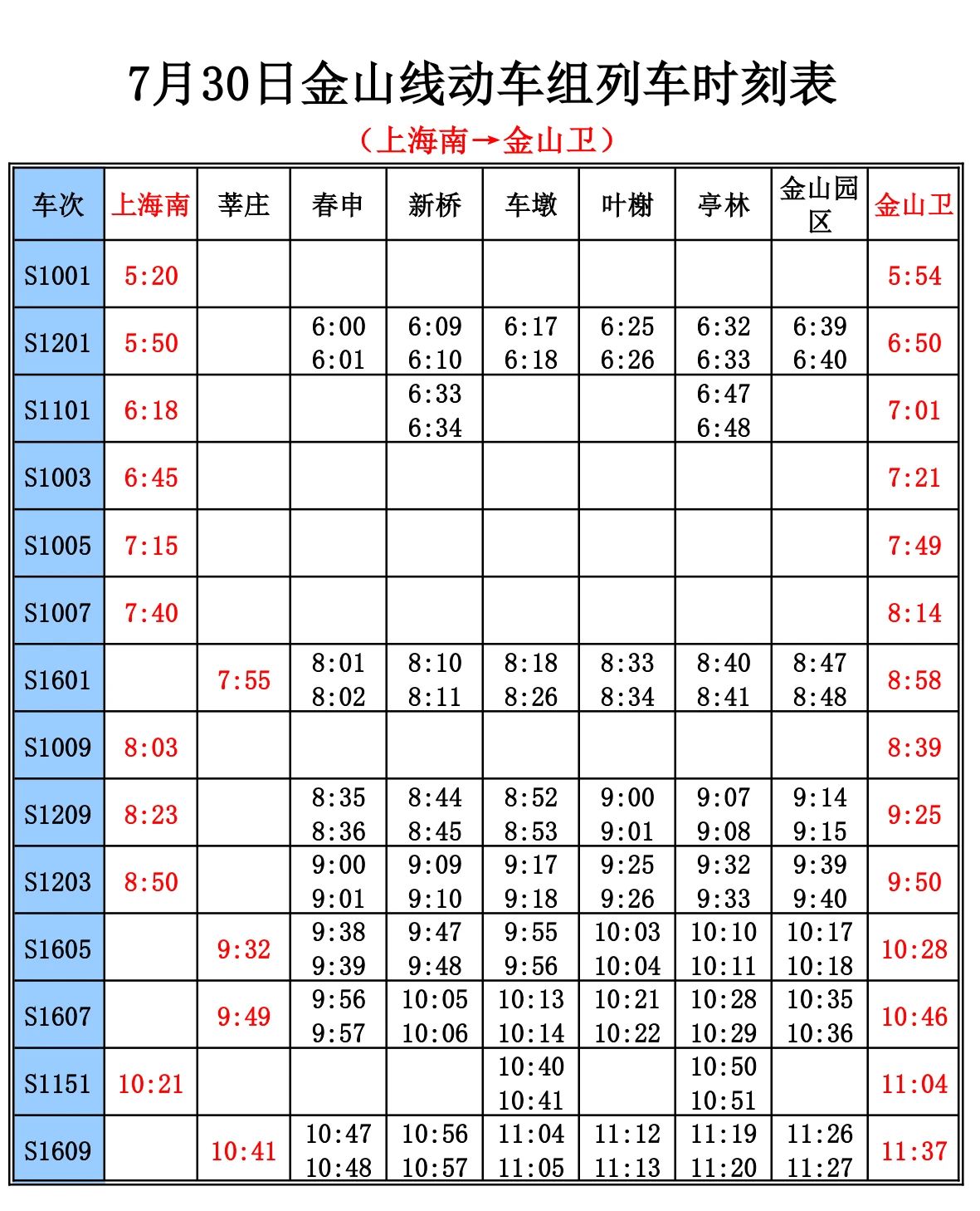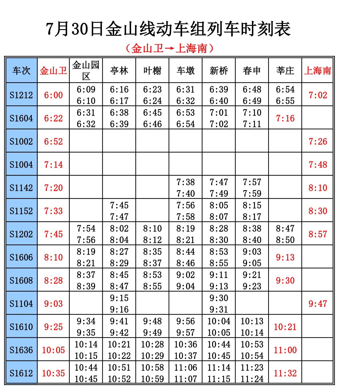 7月30日开行列车时刻表如下: