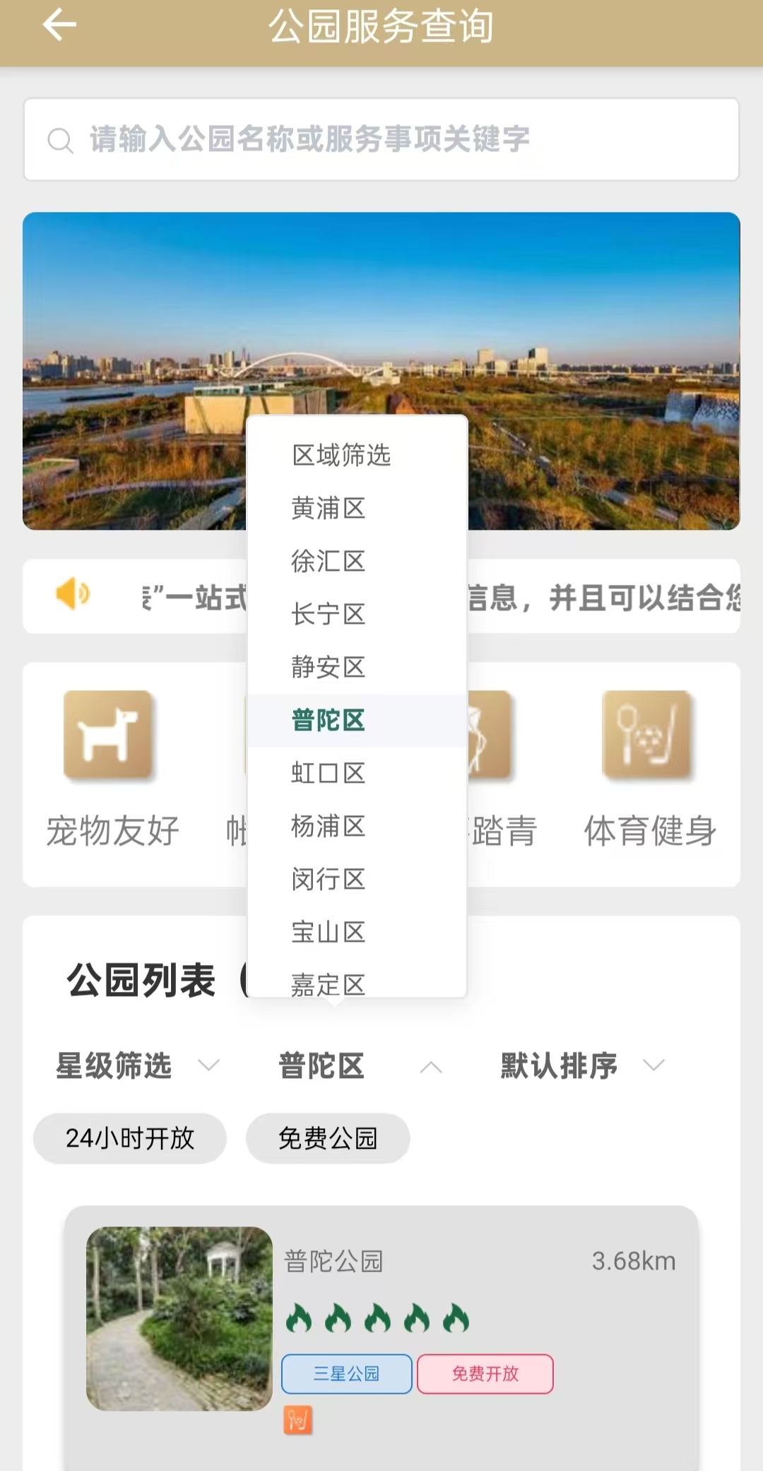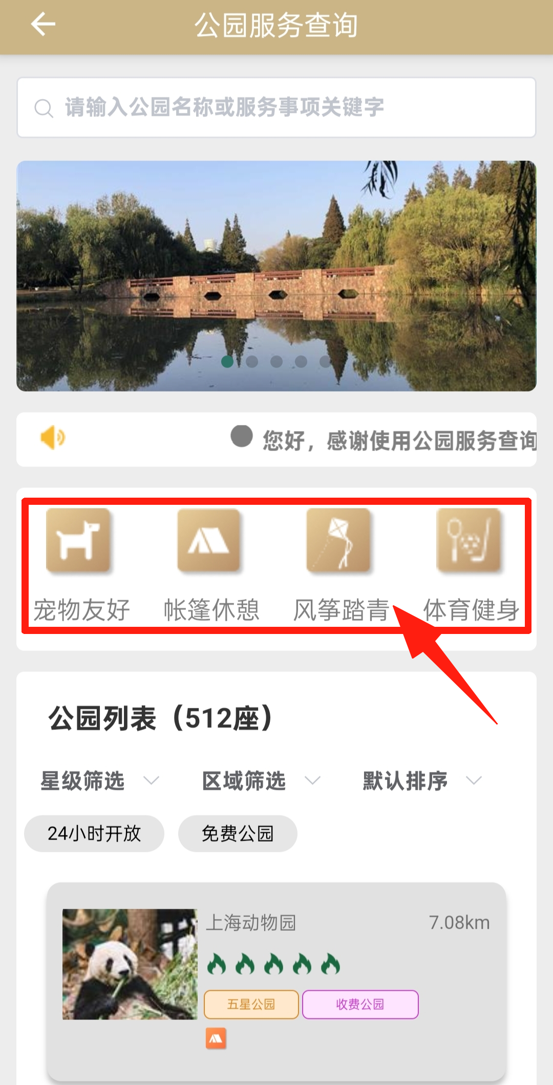 在“公园查询服务”专区,映入眼帘的四个分类:“宠物友好”“帐篷休憩”“风筝踏青”“体育健身”,市民们可以根据自身需求选择相应的分类进行筛选。