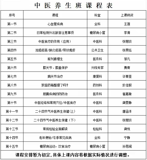 课程内容:本学期将继续从医疗、护理、公共卫生、医技等不同方面开展慢性病、护理、疫苗、康复、用药、化验指标等课程。