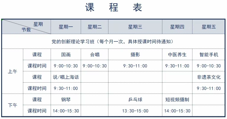 2025年上海市普陀区军休老年大学秋季班如约而至,本学期预开设11个班级:党的创新理论学习班、国画班、跟我学说/唱上海话班、钢琴班、合唱班、摄影班、乒乓球、非遗茶文化班、中医养生班、短视频摄制、智能手机班。欢迎军休干部积极报名参加~