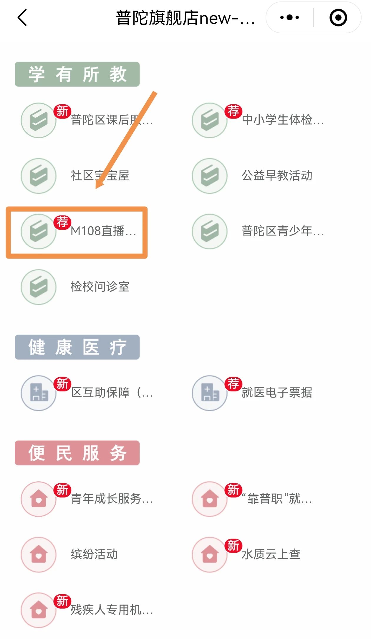 第二步:点击普陀旗舰店首页的“热门应用-更多”,找到“学有所教-M108直播”图标,点击进入