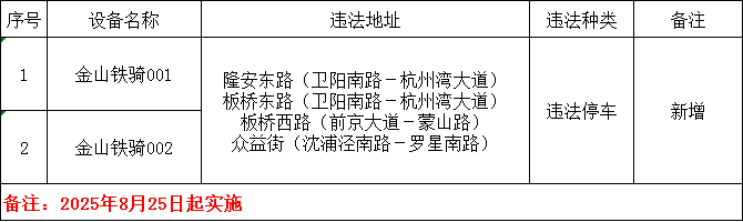2025年8月25日起,金山区新增铁骑违法抓拍电子设备(电子警察)2套,具体点位详见下列图表: