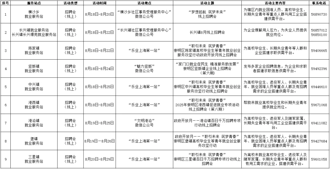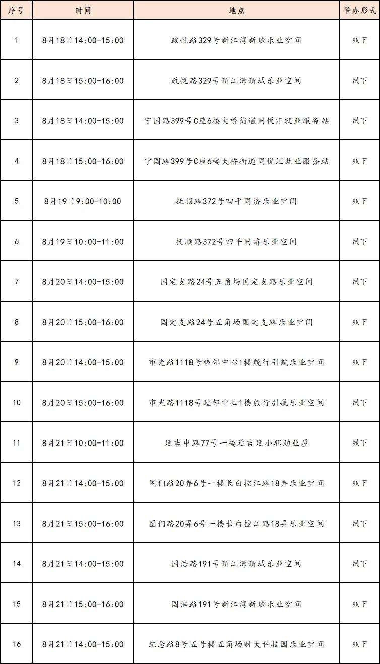 “15分钟就业服务圈”社区就业服务站点建设市政府实事项目作为人社部门常态化政府开放活动之一,我们将持续发布精彩服务内容,今天为大家带来黄浦区、静安区、杨浦区、闵行区、崇明区、长宁区、嘉定区、青浦区近期就业活动安排!
