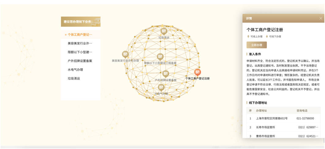 生成业务办理星图后,点击事项即可查看详情,准入条件、办理地址、线上入口一目了然。从营业执照办理到行业许可证申请,从装修备案到招牌审批,每一步都有清晰指引,进度实时可视。
