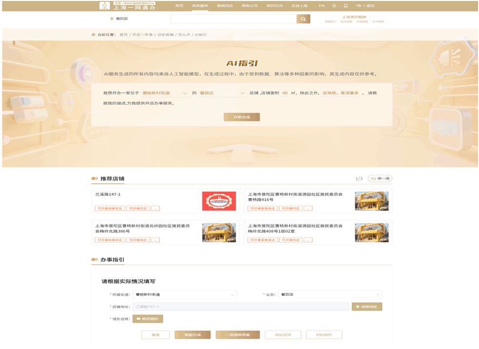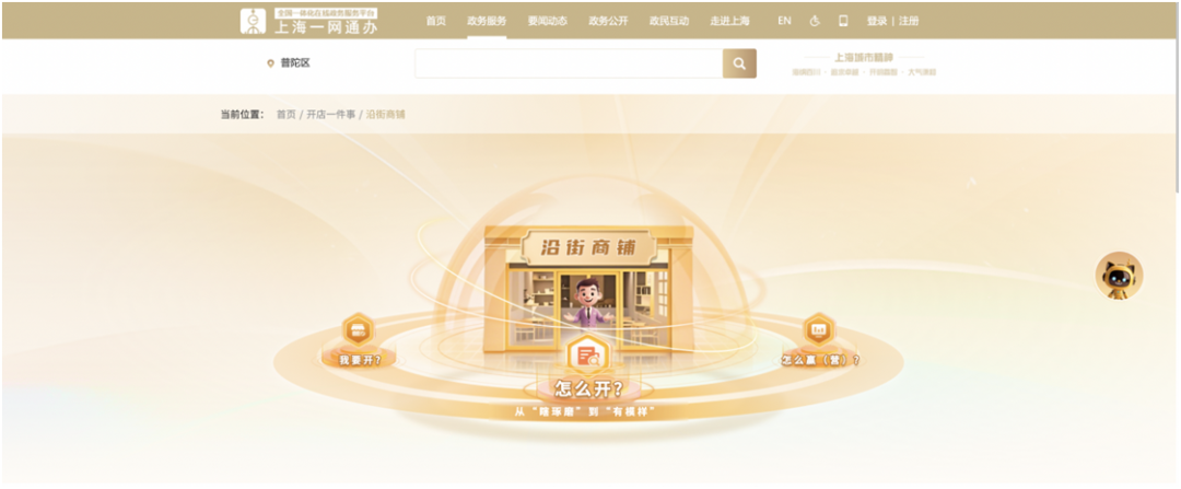 登录上海市“一网通办”官网,选择普陀区进入“开店一件事全生命周期服务专区”,根据店铺类型(沿街商铺/商业综合体)一键进入办理页面。这里不仅有可视化地图选址、智能流程模拟,更能生成专属办事指南,材料预审、表单助填等功能全程护航,让您轻点屏幕,就能解锁开店全流程。