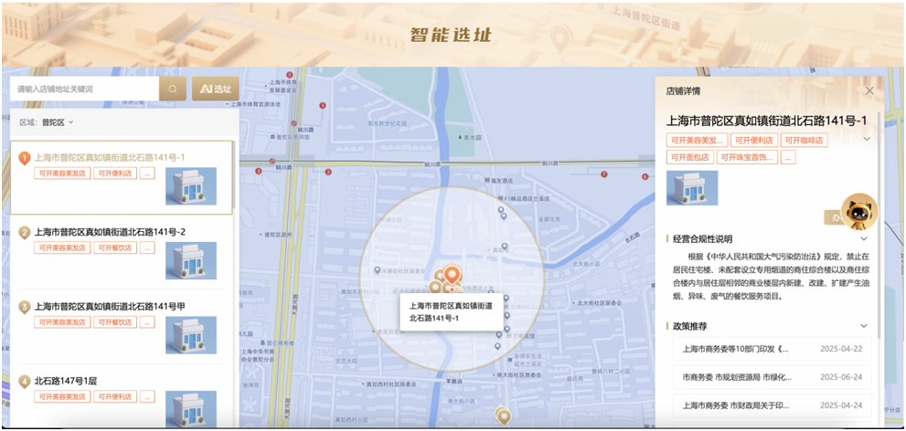 全区重点区域店铺资源一网打尽,地址、图片、政策信息直观呈现,还能查看所选店铺200米内已开店铺的数据,科学决策有依据。输入“在真如镇街道开40㎡近地铁餐饮店”,大模型从面积、区位、客流等多维度匹配空店,省去筛选烦恼。