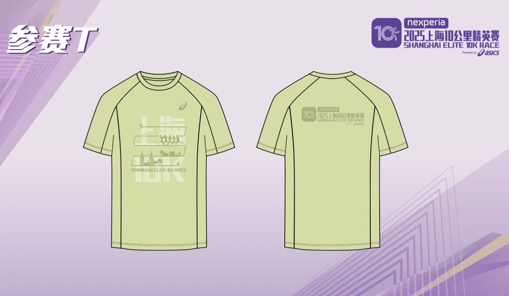 本届赛事的参赛T恤,以充满活力的浅绿黄色为基调,洋溢能量与生机,为跑者营造清新明亮的运动氛围。前胸图案灵感来源于上海长风公园周边的现代建筑轮廓,通过抽象化、符号化的简约线条,勾勒出建筑几何之美与城市脉搏。