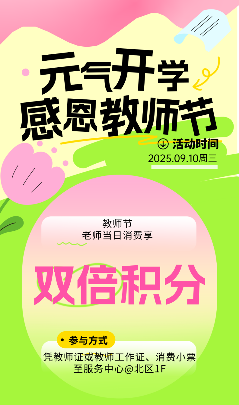 福利一:当日任意消费,前往北区1F服务台,凭消费小票即可参与双倍积分。