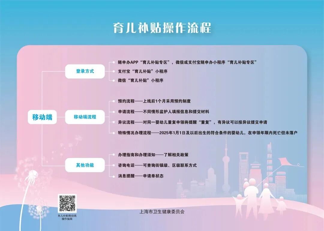 答:以线上申请为主,申领人可通过支付宝、微信平台“育儿补贴”小程序,或通过“随申办”支付宝小程序、微信小程序或“随申办”APP搜索“育儿补贴”,进入育儿补贴申领专区,登录“育儿补贴信息管理系统”申请。