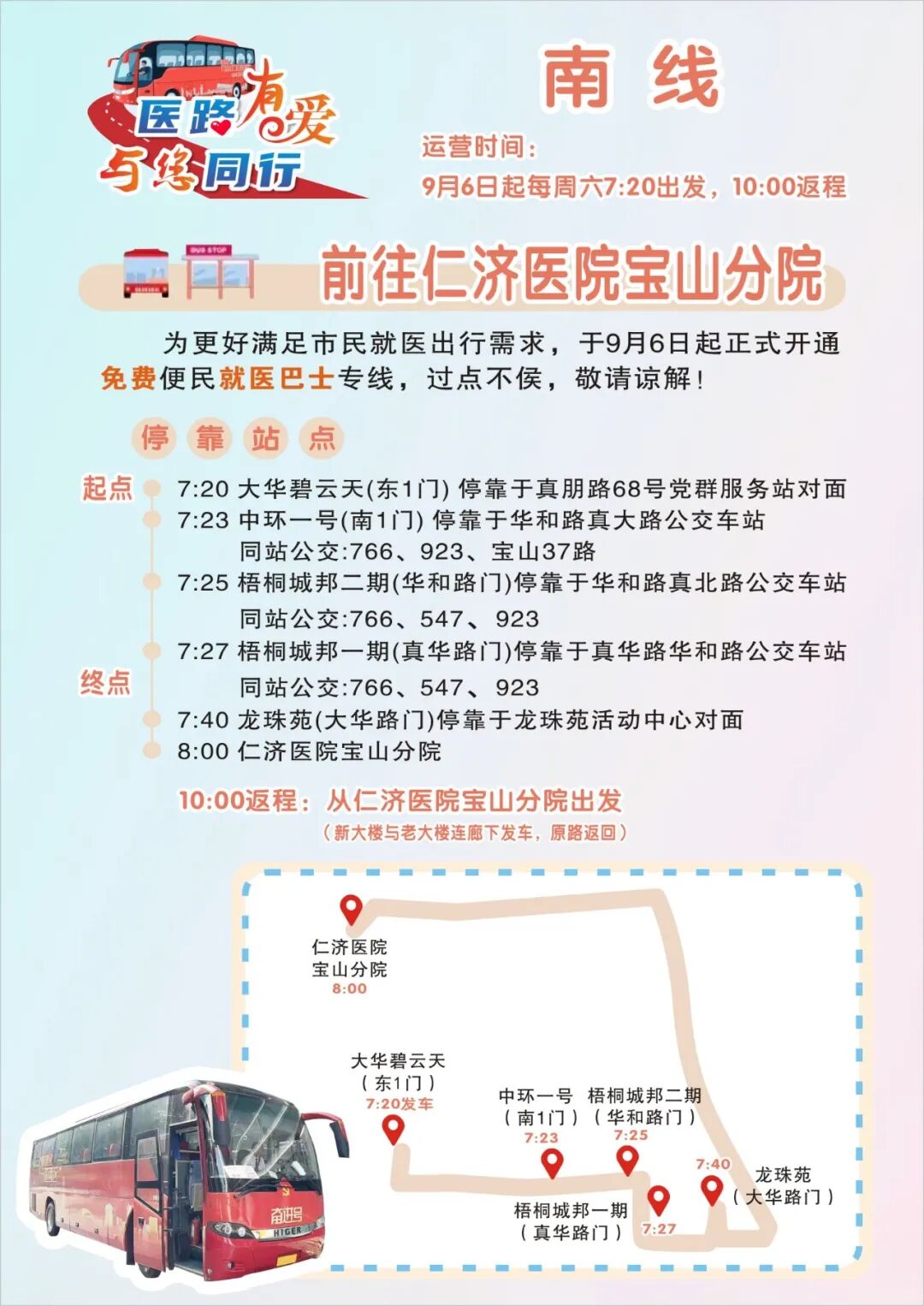 为全面贯彻落实党的二十大精神,积极践行“我为群众办实事”,更好满足市民就医出行需求,于9月6日起每周六正式开通免费便民就医巴士专线——“医路有爱,与您同行”宝山红帆・健康惠民线。